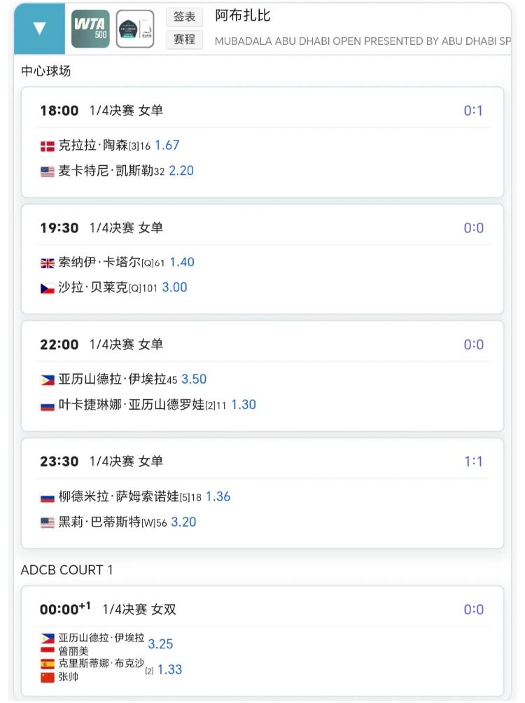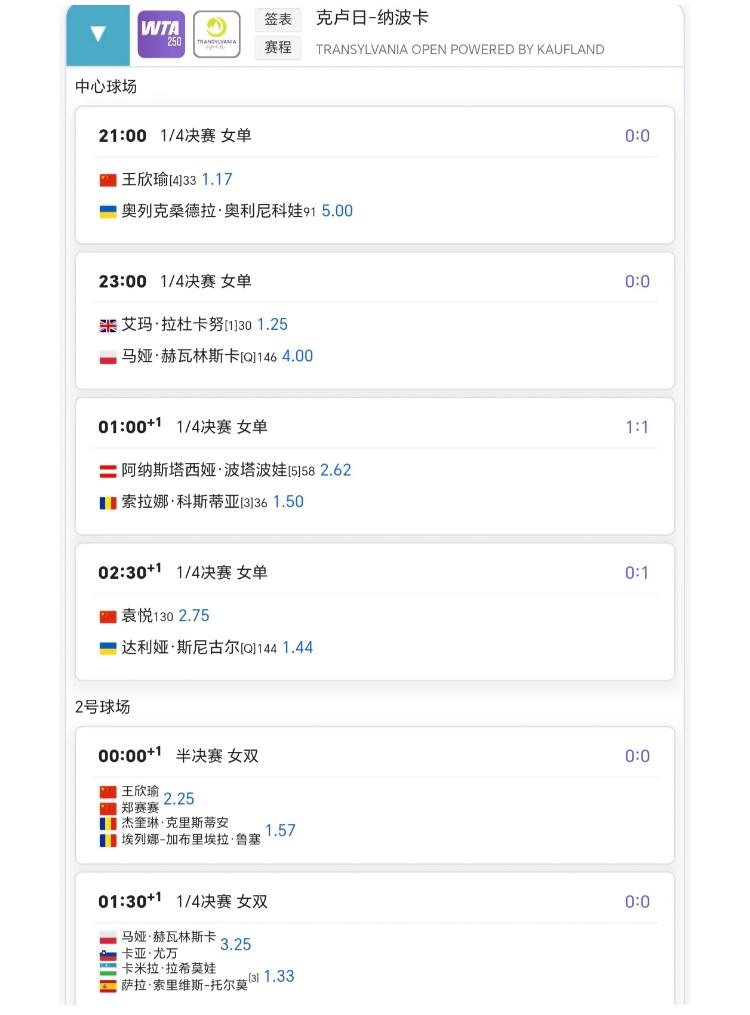 王欣瑜单打完即拿双打放松? 今日纳波卡250赛和阿布扎比500赛赛程 … 王欣瑜21:00中央球场冲女单四强,0:00换到2号球场跟郑赛赛打女双半决赛、哈哈,这有点赶场子吃席的感觉[我想静静]…袁悦的比赛在明天凌晨二点半,也是1/4。张帅明天凌晨0点冲击女双第12连胜!!加油加油,希望金花们都能取得胜利!!!王欣瑜网球 张帅排名
