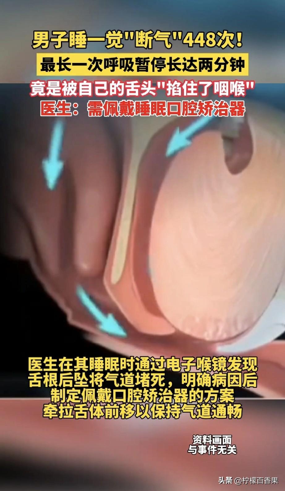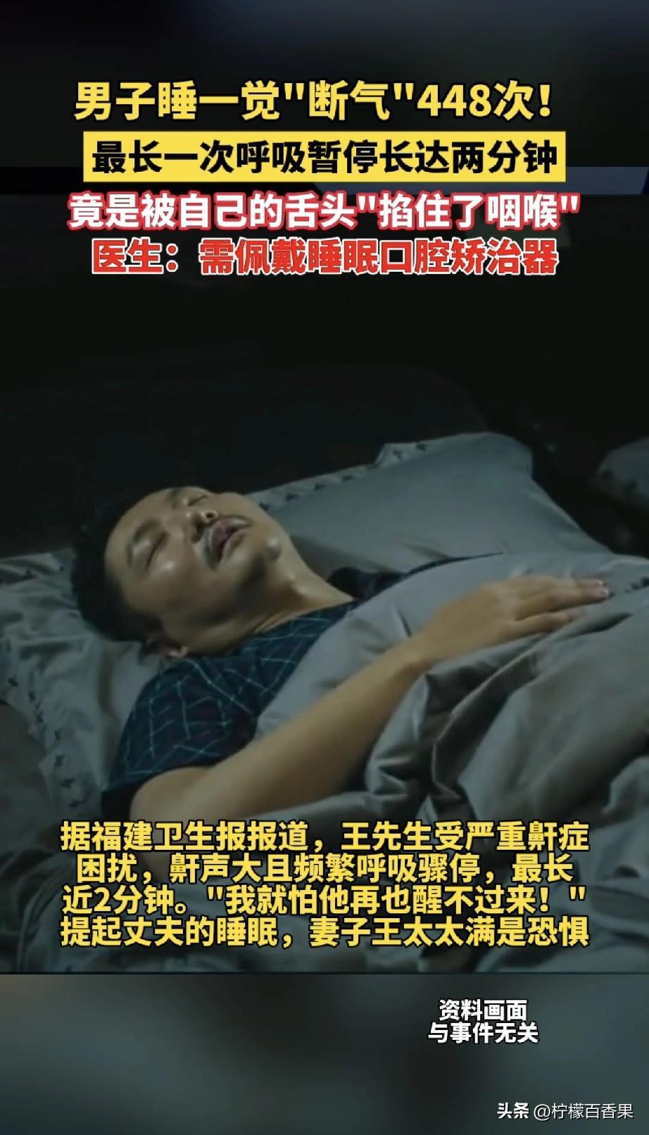 凌晨三点,福建的陈先生又一次从窒息感中惊醒,胸口像压了块巨石,大口喘着粗气。他以为是噩梦,却不知,这已经是他今晚第448次“断气”了。 医生给他做了个睡眠监测,结果一出来,所有人都傻了:8个小时的觉,他呼吸停了448次!平均下来,一小时快60次,最吓人的一次,足足停了115秒,快两分钟了! 这大哥自己还没当回事,说自己就是爱打呼噜,睡得香。结果白天困得不行,开车都差点睡着,这才去医院。 医生用喉镜一看,好家伙!他一睡着,舌根那块肉就彻底“躺平”了,直接往后一坠,把气管口堵得严严实实,跟被自己的舌头掐住了脖子一样,气都喘不上来! 很多人都觉得,打呼噜是睡得香,这真是大错特错!这哪是香啊,这是拿命在睡觉! 这种情况叫“睡眠呼吸暂停综合征”,听着吓人,其实很多人都有,只是自己不知道。长期这么缺氧,高血压、心脏病都找上门,严重的甚至在睡梦中就没了。白天还困得要死,干啥都没精神。 大家赶紧自查一下,你或者你家里人有没有这情况: 1. 呼噜打得震天响,打着打着突然没声了,过几秒又“嗷”一嗓子接上。 2. 白天困得要命,坐着都能打盹,喝咖啡都不管用。 3. 早上起来头疼、口干,感觉一晚上没睡一样。 4. 有高血压,吃了药也老是降不下来。 真的别不当回事!这不是小毛病,是挺严重的事。赶紧转给你身边爱打呼噜的人看看,早发现早治,才能睡个踏实觉!