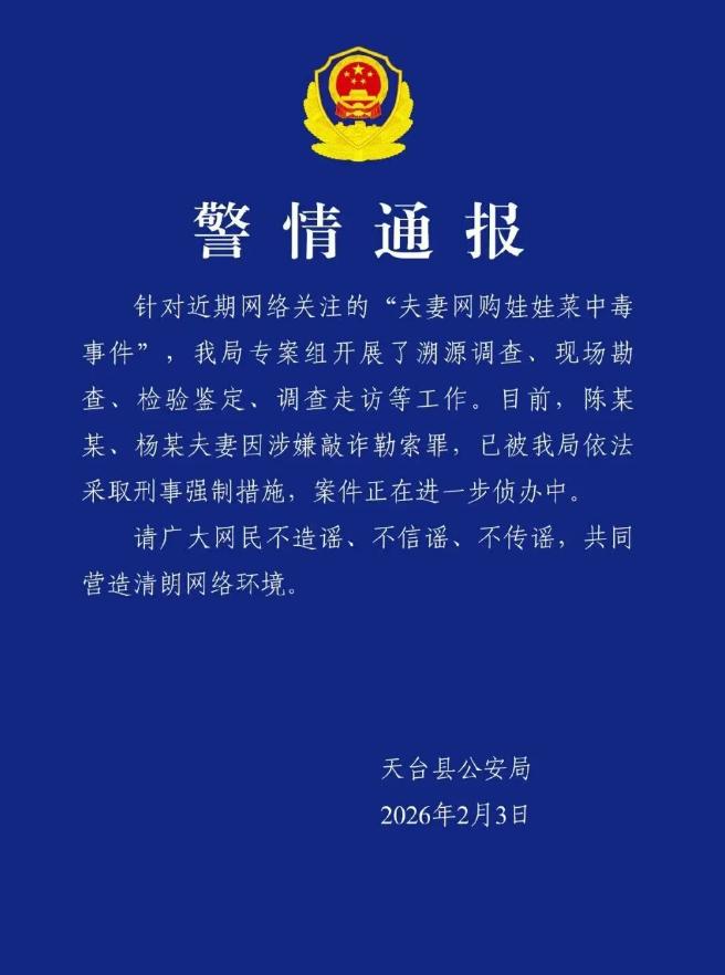 反转、反转再反转的“娃娃菜中毒事件”,终于尘埃落定:确系夫妻合谋自毒骗赔,已被警方采取刑事强制措施! 起因是1月23日,一对夫妻发声说网购娃娃菜,吃完就中毒了。随后有些媒体发文称“警方初步调查确认,毒源系商家为压缩成本,使用沾染杀鼠剂的回收旧报纸包裹娃娃菜”,这下可炸了,因为这是正规媒体发布的消息,有很多人把家里的娃娃菜都给扔了不敢食用。 结果2月3日出现反转!有媒体发布“从权威渠道获悉,下毒者系杨女士的丈夫陈某某”。这一下,该事件被炒作成家庭投毒,一下子从公共事件变成家庭伦理事件。因为丈夫曾经在妻子病床边一脸淡定地接受采访,有些网友开始忧心枕边人了:投毒的另一半,这么淡定、这么能演吗? 还没等大家的情绪消化完,当天警方就出了通报:这是夫妇二人合谋后自导自演的投毒戏,目的就是想要敲诈勒索商家。 不得不说,这对夫妻为了钱财对自己下手挺狠啊,自己都给自己下药了,肝肾损伤肯定避免不了。但凡是这药量没掌握好,俩人可能就真成了鬼夫妻。 现在好了,罪也遭了、钱也花了,真相也败露了。俩人也不用成鬼夫妻了,直接成了看守所里的狱友。 为了一点不义之财,不惜自伤身体、造谣抹黑商家,还引发全网恐慌、浪费公共资源,这般荒唐行径终究逃不过法律制裁,也给所有人提了醒:歪心思碰不得,违法必受惩!