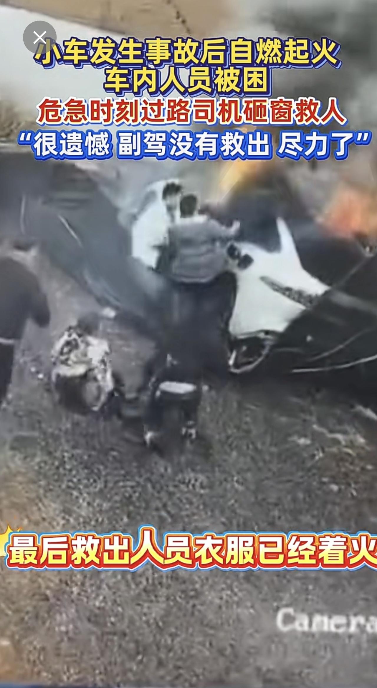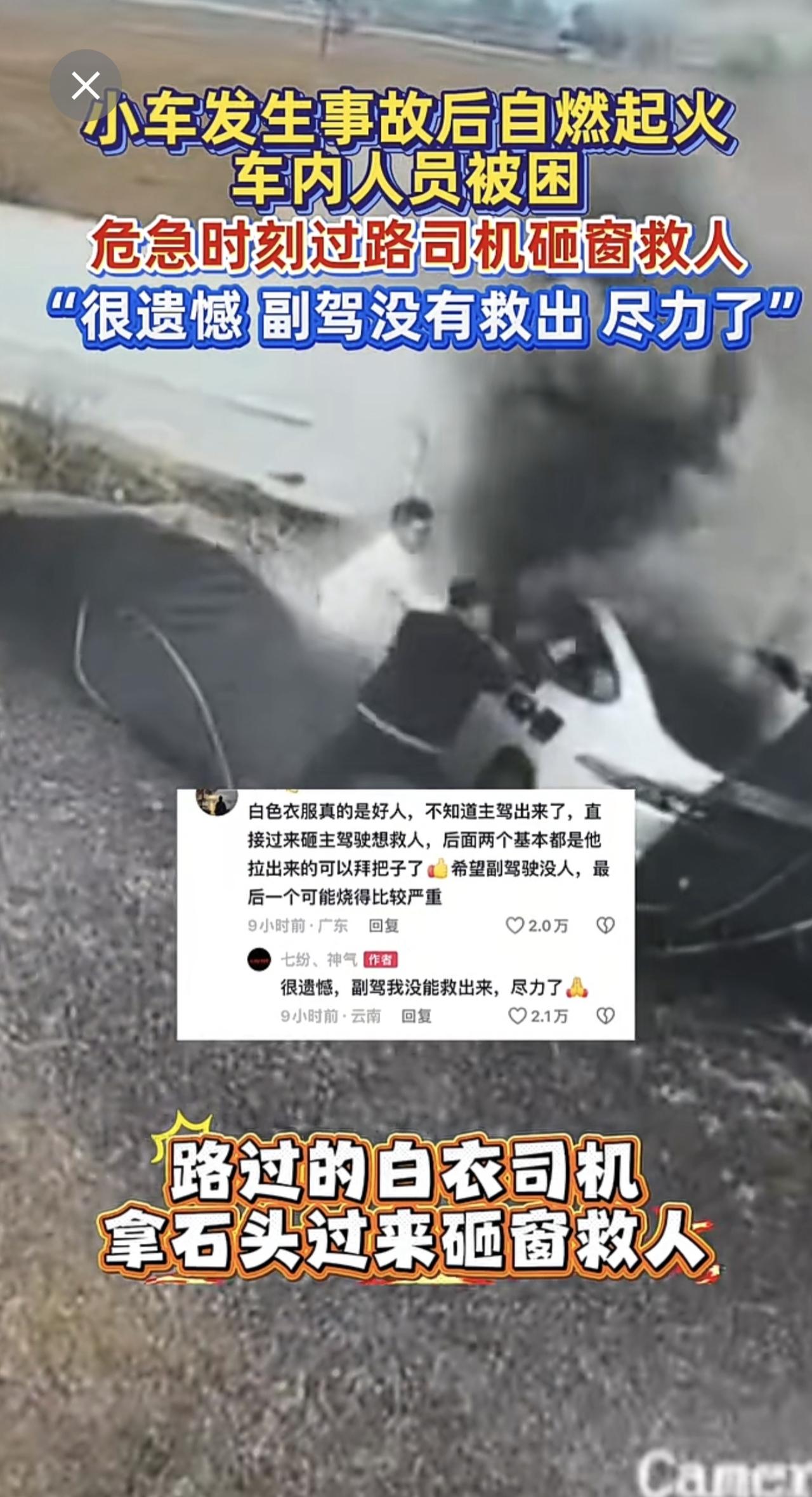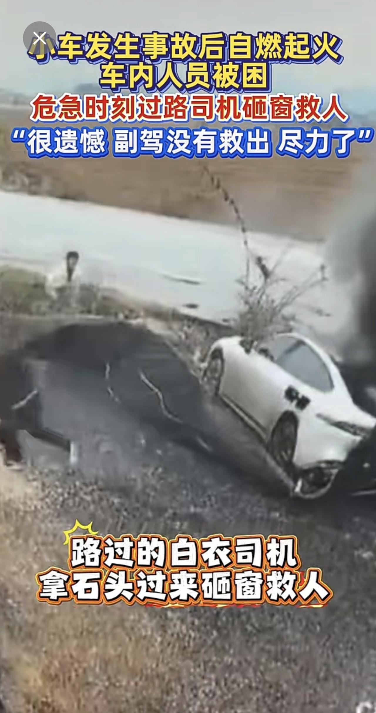 小车失控起火,路过司机英勇砸窗救人[赞]