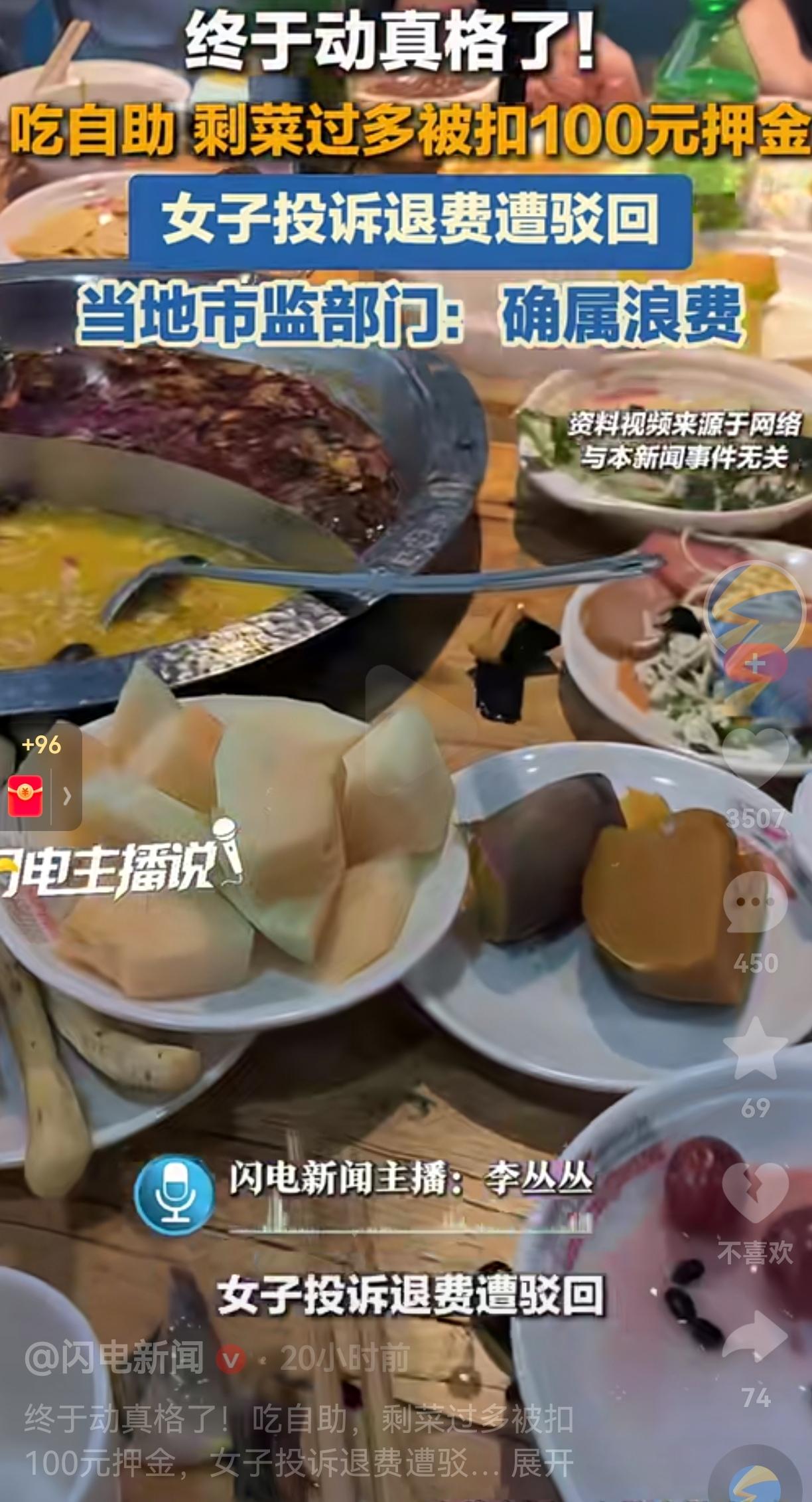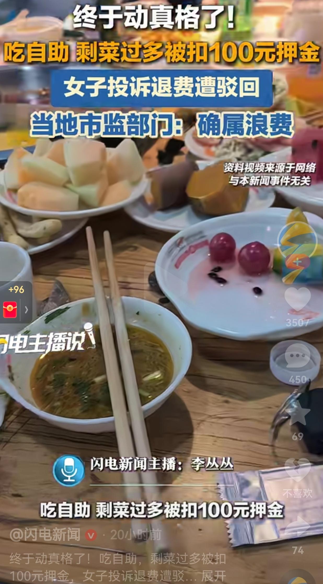 既然原则吃自助餐,就要遵守人家饭店的规则!你明明不讲武德,还一心想着投诉,最后被驳回也是自作自受! 湖北襄阳的刘女士跟朋友4个人去吃自助烤肉,刚进饭店,工作人员按照规定就收了100块的押金,人家还特意提醒:“咱们店有规定,剩菜不能超过150克,不然押金不退。” 结果吃完出门时,服务员一称重,桌上居然剩下了400多克的菜,还有整整8份食物根本没动过。 店家二话没说扣了押金,刘女士不服气,直接把这事投诉到了12315平台,想着维权讨个说法。 谁知道市监部门一调监控,当场就认定“确实属于浪费”,不仅驳回了她的退款请求,还明确表示:餐厅扣押金的做法合理,没有任何过错。 网友看到后评论说:“这事一点不冤!明着提醒了剩菜超150克扣押金,还硬造400多克浪费,8份菜都没动,这不是纯纯眼高手低吗?” 还有的网友说:“市监干得漂亮!终于不是和稀泥了,光盘行动喊这么久,就该有实际约束,不然都不当回事!” 看到这,我脑子里第一反应是:这不就是我们常说的“眼大肚子小”吗? 每次去自助,总想着“吃够本”,什么贵拿什么,结果端回来一桌子,最后剩下一大半。以前可能店家睁一只眼闭一只眼,现在真的动真格了! 其实店家收押金这个事,早就不是新鲜事了。但这次市监部门直接站店家,等于给所有浪费党敲了个警钟:光盘行动不是一句口号,是真的要落到饭桌上的。 有人说店家这是“霸王条款”,但反过来想,开自助的老板也不容易。你剩下的每一口菜,都是人家真金白银的成本。 更重要的是,我们从小学的“谁知盘中餐,粒粒皆辛苦”,不能到了饭桌上就忘了。 说白了,这100块押金,罚的不是钱,是我们骨子里那点“贪小便宜”和“浪费不心疼”的毛病。 对此,你怎么看呢?欢迎大家评论区讨论留言。