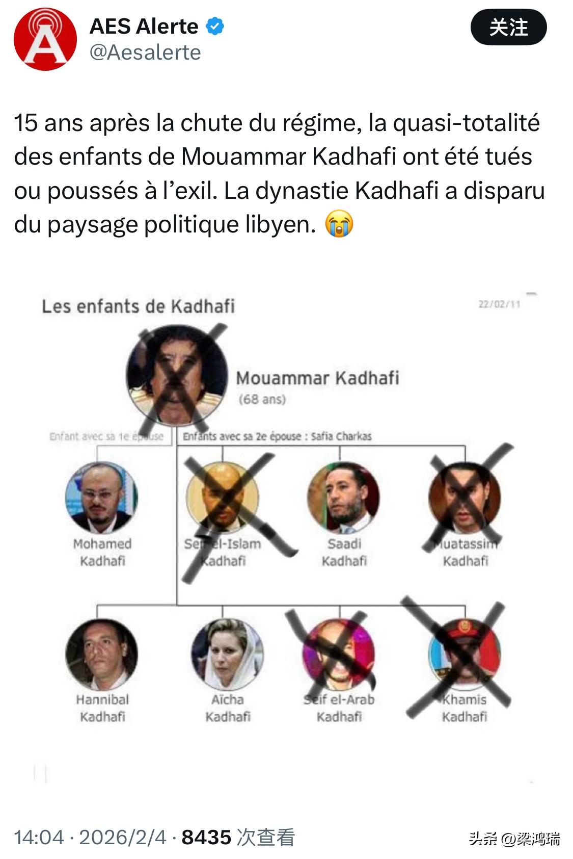 卡扎菲政权倒台十五年后,卡扎菲家族的命运在2026年初再次发生了重大转折。曾经最被看好的继任者赛义夫·伊斯兰·卡扎菲(Saif al-Islam Gaddafi)已于2026年2月3日遇刺身亡,这标志着卡扎菲王朝在利比亚政坛东山再起的最后希望基本破灭。 以下是卡扎菲子女核心成员动态(2025-2026年更新) 赛义夫·伊斯兰(Saif al-Islam):遇刺身亡(2026年2月) 2026年2月3日,53岁的赛义夫在利比亚西部城市津坦(Zintan)的住所内遭到四名蒙面武装分子袭击身亡。袭击者破坏了监控设备后闯入将其杀害。他曾于2021年尝试竞选利比亚总统但被取消资格,遇刺前仍试图在利比亚复杂的军阀割据中重塑影响力。 汉尼拔(Hannibal):获释流亡(2025年11月) 卡扎菲最年幼的儿子。他在黎巴嫩被关押近十年后,于2025年11月10日至11日正式获释。他支付了约90万美元的保释金并被取消了旅行禁令。获释后他离开了黎巴嫩,有猜测认为他可能前往南非寻求庇护。 阿伊莎(Aisha):低调流亡 卡扎菲唯一的亲生女儿。她目前主要居住在阿曼苏丹国,条件是不得从事任何政治活动。虽然曾有报道称她可能移居约旦,但2023至2025年间的多数记录显示她仍留在阿曼。 随着赛义夫·伊斯兰的去世,卡扎菲家族在利比亚国内的实体政治存在已几乎消失。 政治符号的消亡: 赛义夫曾是旧政权支持者(绿色运动)的核心寄托,他的死消除了可能统一旧部力量的关键人物。 司法终结: 尽管利比亚总检察长已对赛义夫遇刺案展开调查,但分析普遍认为,这一事件简化了利比亚目前的政治重组僵局。