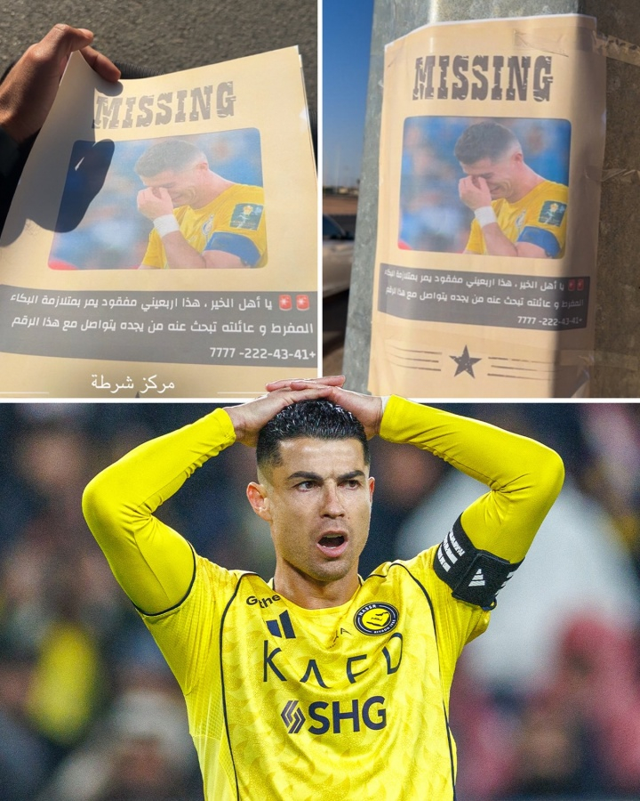 沙特多地贴寻人启事嘲讽C罗罢赛:寻找一名过度哭泣的40多岁男子