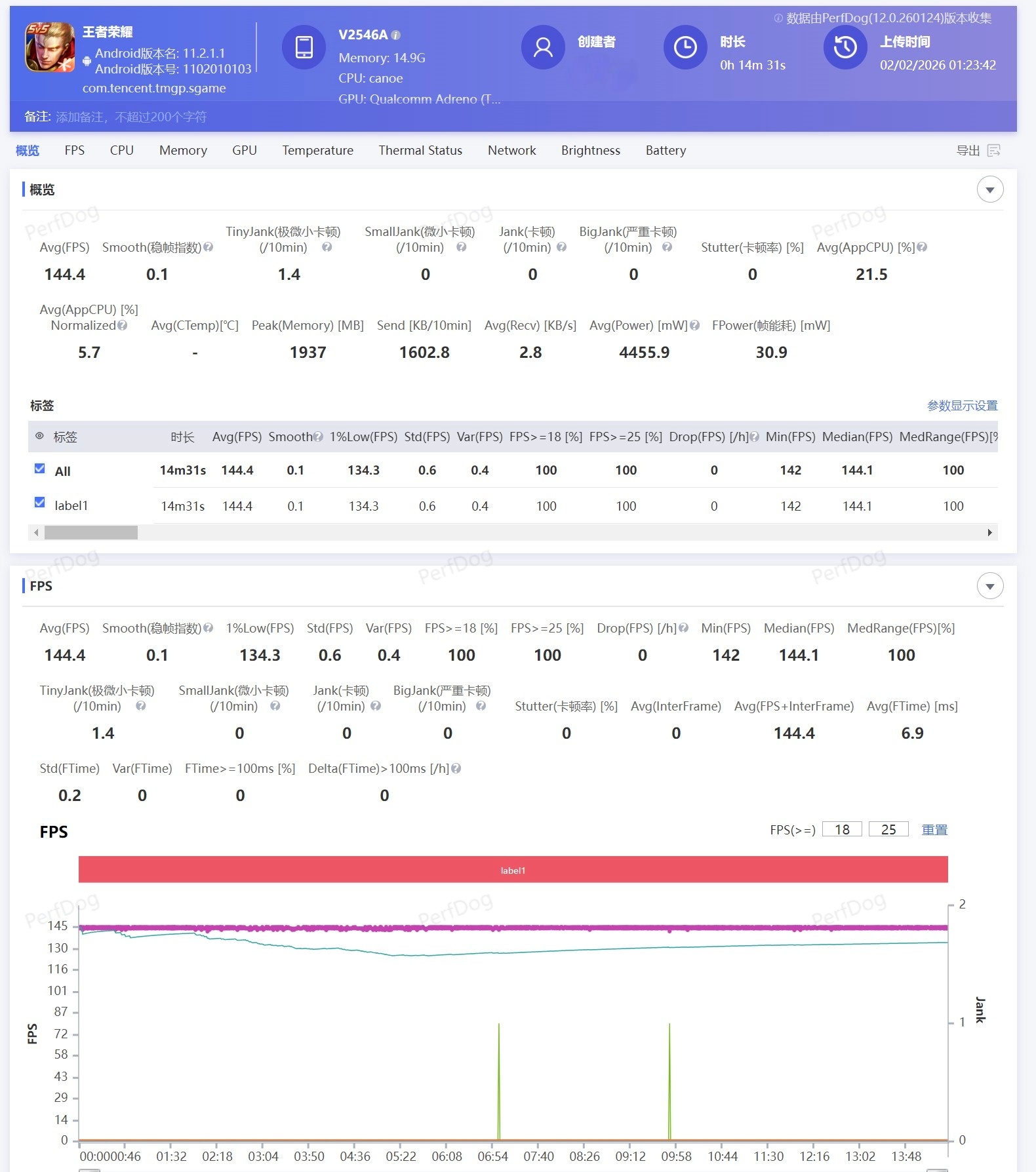 这次iQOO15 Ultra的确太开挂了,配置方面非常顶,处理器是最顶级的第五代骁龙8至尊版,内置主动散热风扇,玩游戏发热控制得非常到位,全程顶着满帧跑,体验相当丝滑。国民游戏王者荣耀完全不在话下,开超画超帧一把下来,平均帧率维持在144.4,更夸张的是1%low帧也高达134.3,比很多机器的表现都强,说是性能Ultra一点问题没有,是一款很适合电竞主播OR极致性能玩家的机型。
