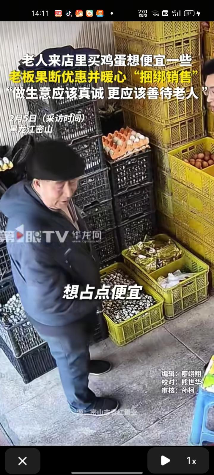 2月4日,鸡西密山市。老人来店里买鸡蛋想便宜一些,老板果断优惠并暖心“捆绑销售”,为了方便,还帮大爷拿箱子,等待的时候给大爷拿凳子。后得知大爷不好拿鸡蛋时,老板叫来妻子帮忙搬回去。 老板袁先生表示,年轻人做生意应该讲究真诚,更应该善待老人。