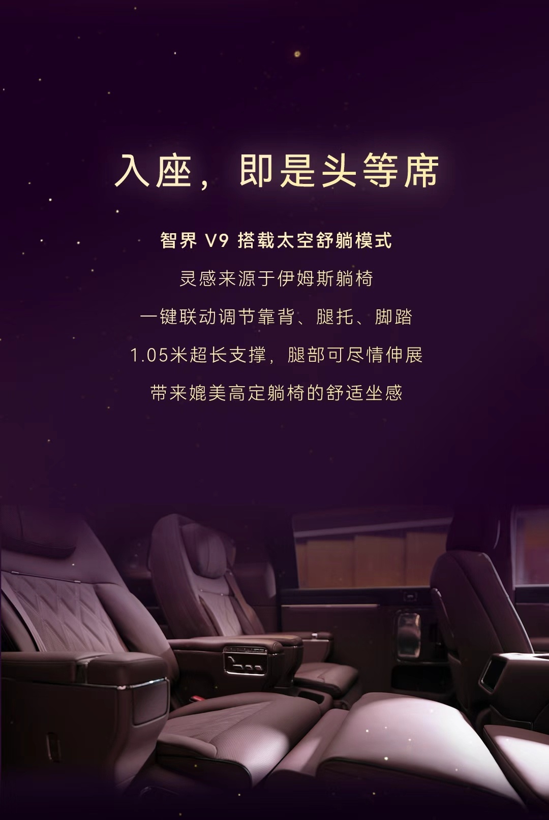 智界V9内饰首次曝光鸿蒙智行首款旗舰MPV智界V9内饰正式亮相!首发专属绒霞紫内饰配色,搭配天然实木饰板、NAPPA真皮包覆。二排配备可旋转航空座椅,解锁双零重力模式+太空舒躺模式。
