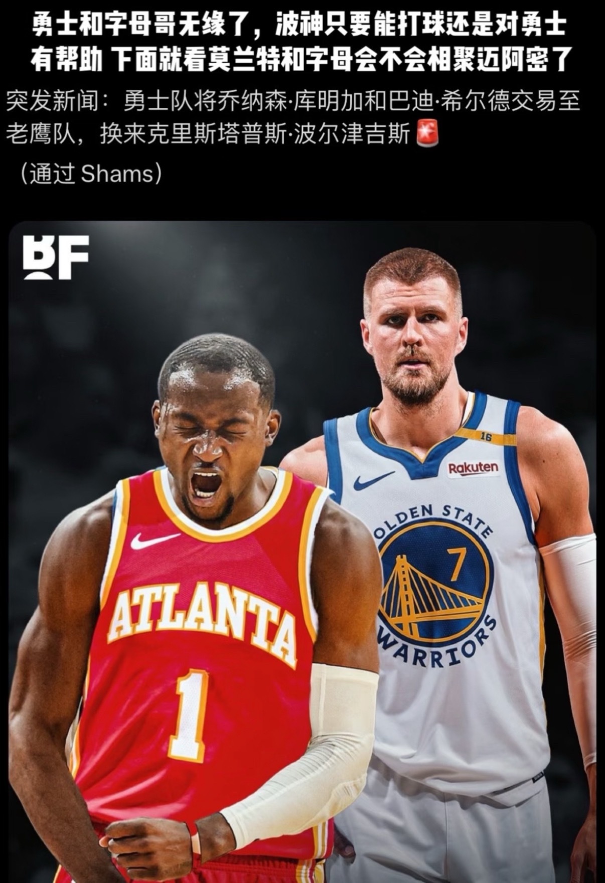 勇士老鹰交易 勇士老鹰2换1达成!勇士送库明加+希尔德,换来波尔津吉斯,补强内线空间与护框,助力库里冲冠,无选秀权参与。