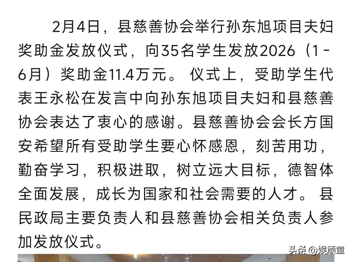 昨天,东方小孙资助的35名学生每人收到大概4000元左右的助学金! 这只是2026年上半年的! 资助学生那么久,东方小孙自己没说过,更没露过面,而且助学金都是提前发放,让孩子们无后顾之忧! 这样的行为真的是体面,又周到,能够把慈善融入日常,怎么会是不好的人呢!
