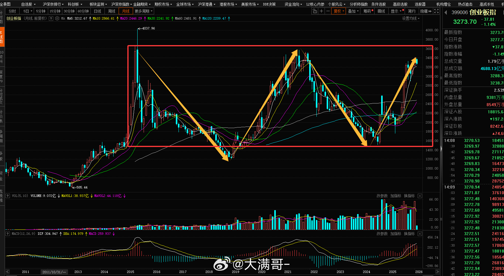 当前创业板月线处于在中期箱体上沿附近(约 3300-3400 点)蓄势;短期大概率先震荡整固,中期(2026 年 Q2-Q3)在量能 + 基本面 + 政策共振下有望突破,目标3576 点历史次高,长期看挑战 4000 点整数关。