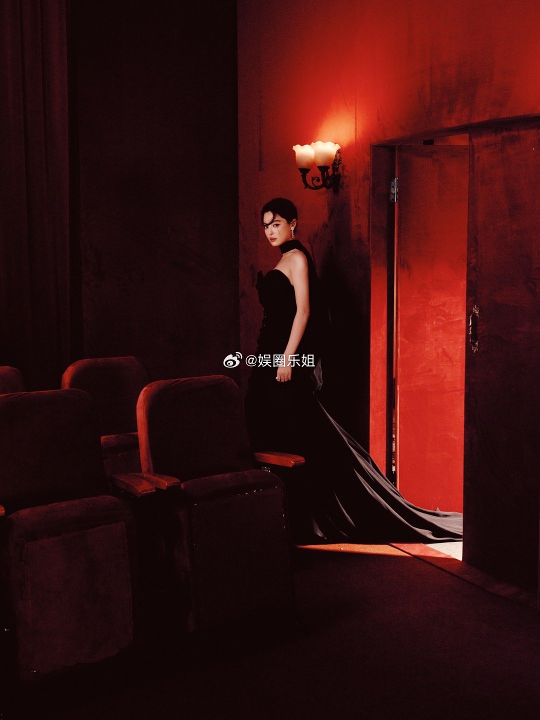 辛芷蕾微博之夜ES高定亮相|以全黑造型强势诠释暗黑浪漫。礼服以黑色丝绒抹胸与轻盈薄纱披风碰撞,腰部镂空鱼尾剪裁极致勾勒曲线。Chanel臻品珠宝如暗夜星光点亮全身,完美烘托冷艳气场。