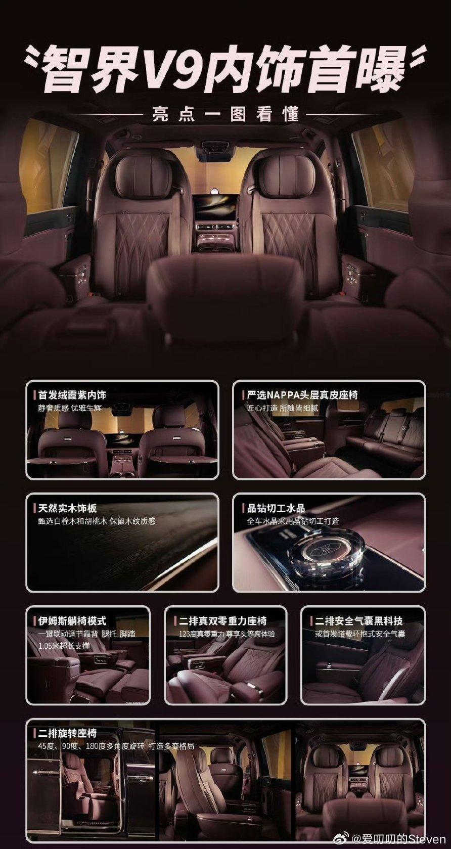 智界V9内饰曝光,旋转座椅的多种模式展示,座椅的整体质感非常好,零重力模式状态空间也非常夸张,不出意料音响组合是HUAWEI Sound 非凡系列。目前来看整体豪华感还是很不错的,你们觉得呢。智界v9