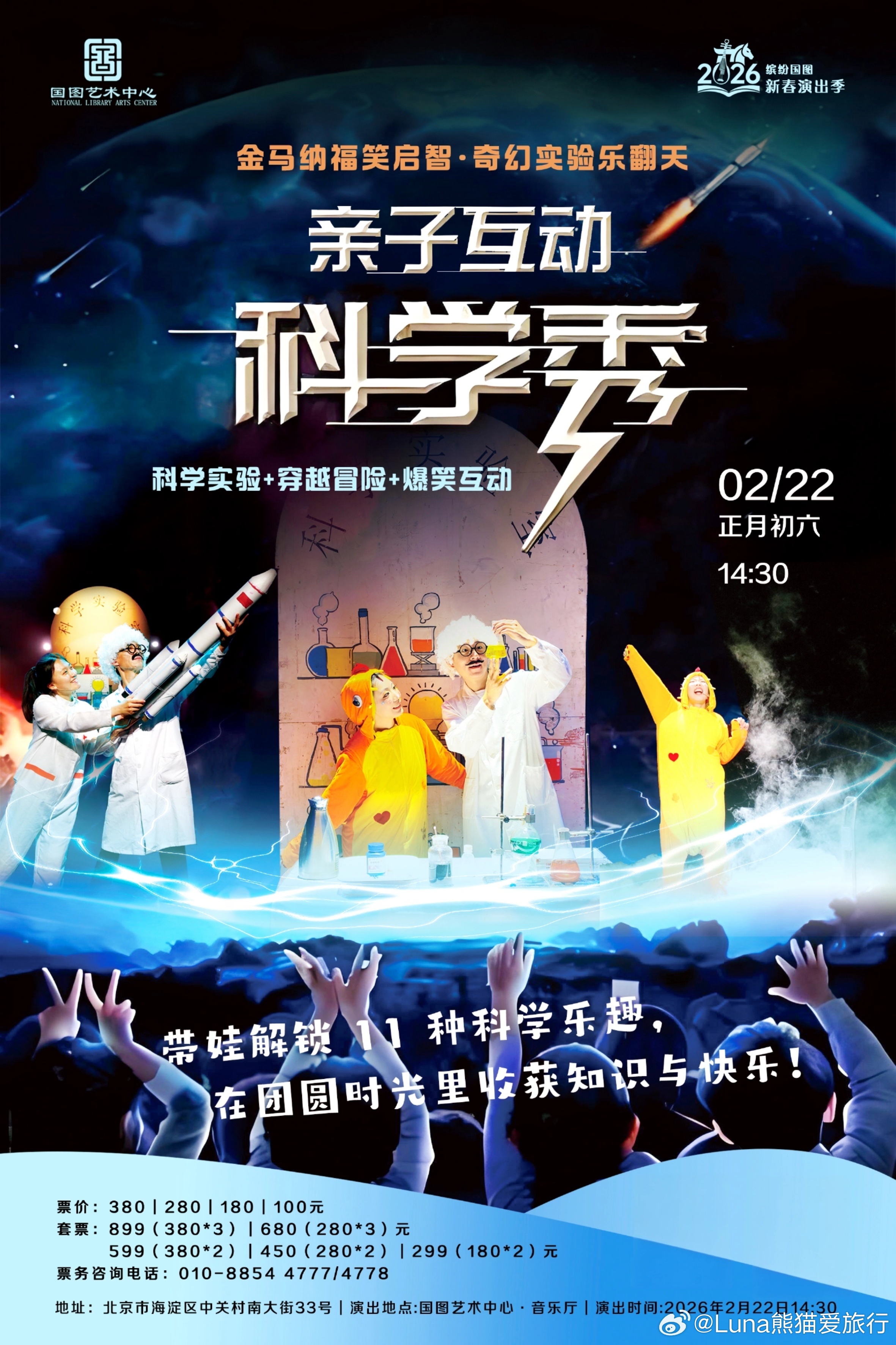 2026年2月22日,国图艺术中心·音乐厅即将上演《金马纳福笑启智·奇幻实验乐翻天》亲子互动科学秀。来现场,带娃解锁11个神奇实验!液氮烟花、火山爆发、穿越火箭… 爆笑剧情+动手互动,知识+快乐双重暴击~ 100元起抢亲子票,三人套票680元起,正月初六14:30国图艺术中心,遛娃党直接锁死!闭眼冲不踩雷~国图艺术中心缤纷国图2026新春演出季北京亲子演出新春带娃攻略奇幻实验乐翻天