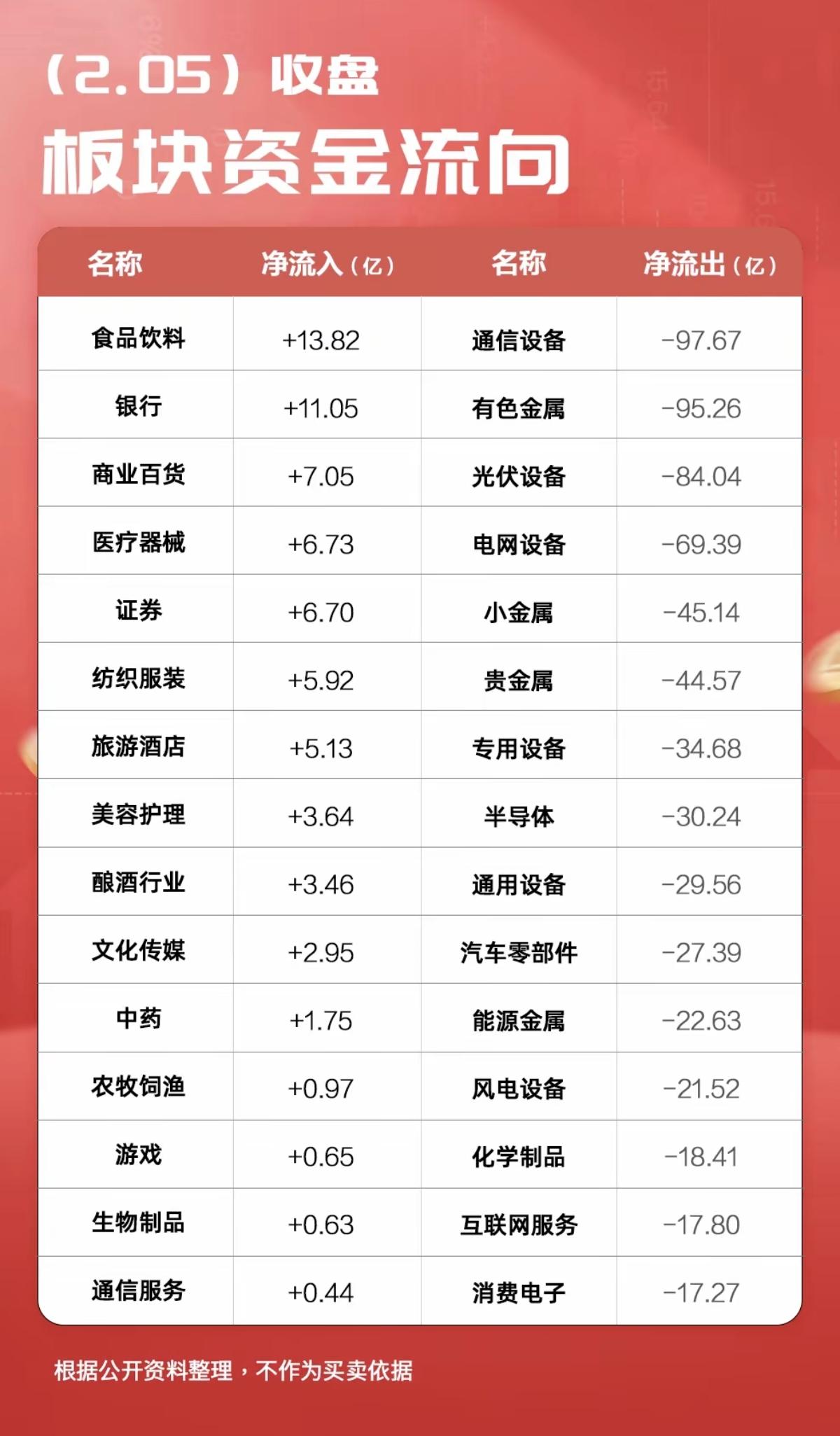 2.5周四 收盘 板块资金 流向监测! 资金流入:前三名 食品饮料、银行、商业百货 资金流出:前三名 通信设备、有色、光伏设备
