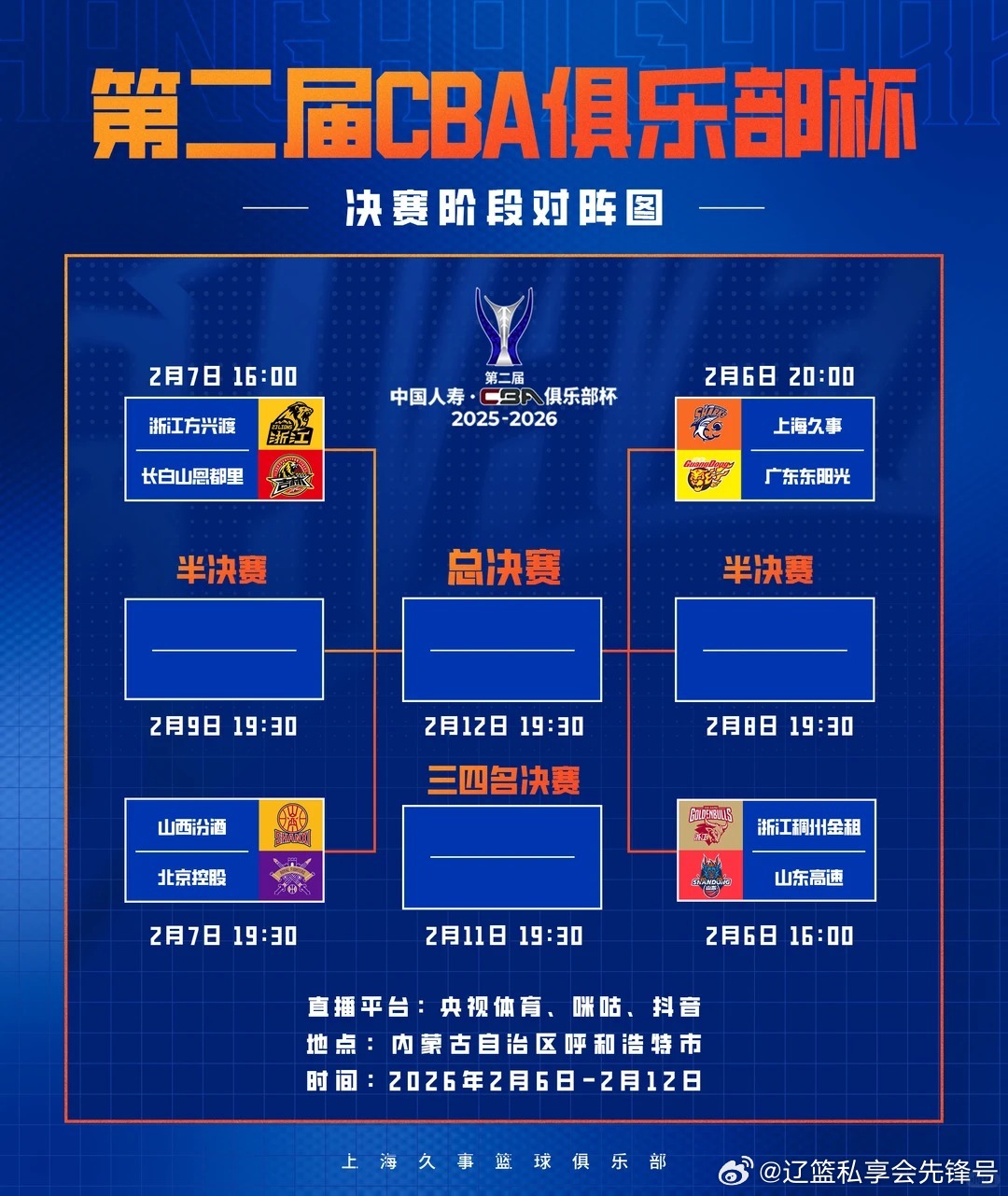 第二届CBA俱乐部杯决赛阶段将于明日(2月6日)在内蒙古呼和浩特正式开赛,开幕式定于当日19:20举行,前辽宁男篮主帅杨鸣将携手郑海霞、巴特尔等十位篮球名宿现身,与球迷共赴篮球盛宴。赛事持续至2月12日,历经小组赛激烈角逐,浙江稠州、山东高速、上海久事等8支球队成功晋级,将通过单败淘汰制展开冠军争夺,每场比赛均为“赢或回家”的生死对决,赛事悬念拉满。