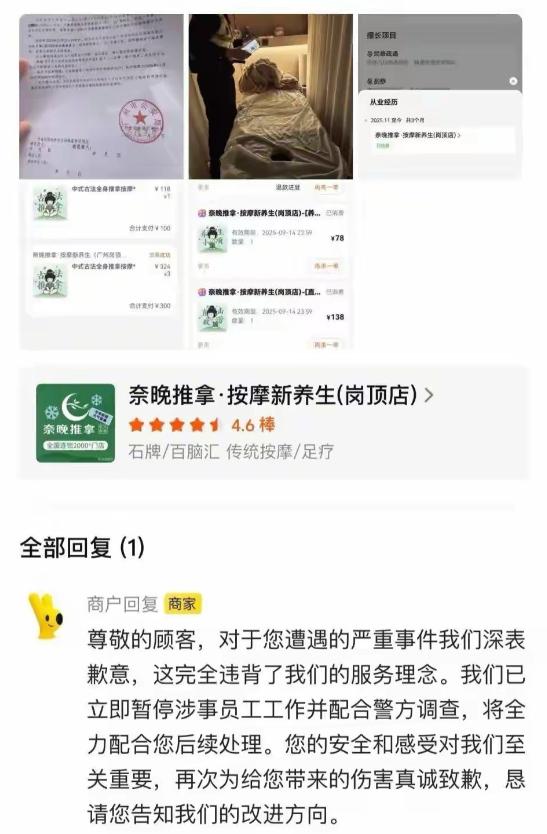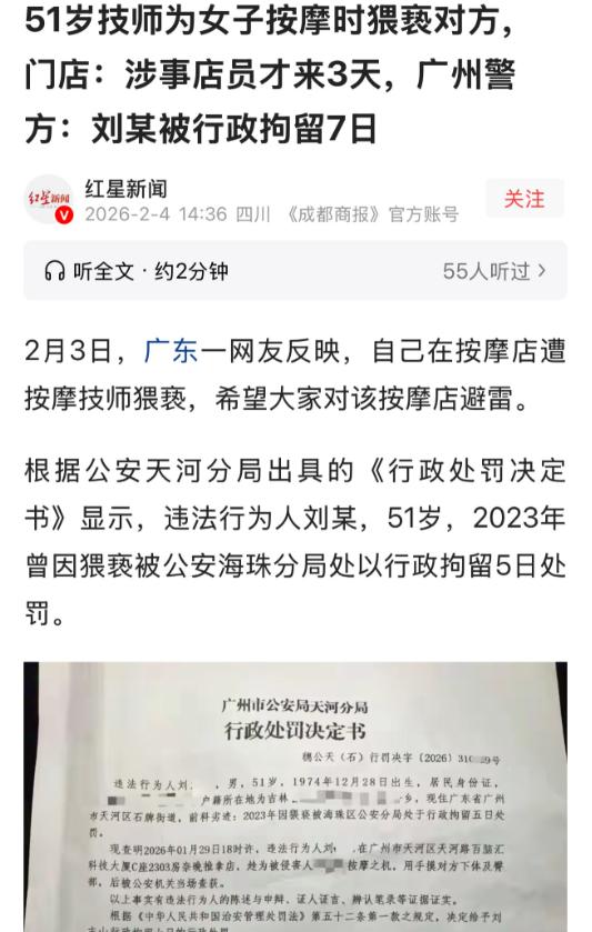 广东,女子去一按摩店按摩放松,却被51岁男技师猥亵,按摩下体臀部,女子愤怒报警。原来技师是惯犯,当即被处罚,女子则要求按摩店给出处理意见,老板表示以后女子来按摩免费,女子很不满意。 1月29日晚上。当天,20岁的女网友结束了一天的行程,身体感到明显疲惫,便想着找一家看起来正规、口碑尚可的按摩店放松一下。她通过平台筛选,最终选择了位于广州天河区天河路的一家连锁推拿店。对方主打“正规理疗”“连锁经营”,从外观到宣传,都给人一种相对安全、规范的印象。 到店后,前台将她引入包房,并安排了一名男技师为其服务。技师刘某,51岁,从表面看并无异常。女网友并未提出更换技师的要求,换好衣服后便躺下接受按摩。起初,整个过程与普通按摩并无不同,她闭着眼睛,逐渐放松,甚至有些昏昏欲睡。 变故发生得很突然。她先是感觉到对方的手部动作出现异常,触碰到了本不应触及的身体部位。最初,她以为是自己过于疲劳产生了错觉,并未立刻作出反应。但很快,对方的动作再次越界,手部触及了她的下体和臀部区域。这一次,已经不可能再被理解为“误触”。 女网友当场睁眼呵斥对方,明确表达拒绝,并第一时间报警。警方随后赶到现场,将刘某带回派出所调查。整个过程持续时间并不长,但对于当事人而言,已经构成了一次清晰而直接的侵害。 调查结果很快出来。警方核实发现,刘某并非首次实施类似行为。早在2023年,他就因猥亵他人,被公安机关处以行政拘留5日。这一次,在按摩服务过程中再次违背顾客意愿触碰隐私部位,属于重复实施同类违法行为。 依据《治安管理处罚法》第44条规定,猥亵他人的,处五日以上十日以下拘留;有其他严重情节的,处十日以上十五日以下拘留。司法实践中,“有前科”“再次实施”通常会被认定为情节加重因素。最终,警方依法对刘某作出7日行政拘留的处罚,程序和结果均符合法律规定。 在行政处罚作出后,女网友并未就此结束维权。得知刘某存在猥亵前科后,她将矛头转向了涉事按摩店,要求店方给出合理解释和处理方案。她关注的不仅是个体行为,更是店铺在人员招聘、管理审核方面是否存在明显疏漏。 然而,店方给出的回应,并未正面触及问题核心。店长提出的所谓“解决方案”,是给予女网友后续免费到店按摩的福利。这一说法当场遭到拒绝。女网友反问:“是想让我每次来,都重新回忆一次被猥亵的经历吗?” 从法律角度看,这种处理方式本身就存在明显不当。按摩服务属于高度依赖信任和身体接触的消费场景,一旦发生侵权,合理的补救措施应当围绕停止侵害、赔礼道歉、赔偿损失展开,而不是以继续提供同类服务作为“补偿”。 直到2月1日,店铺负责人仍未出面,仅由店长与女网友沟通。女网友随后将自己的经历发布到网络,引发舆论关注。媒体介入后,店方回应称,刘某是新入职员工,尚处于试工期,上岗仅三天再次被警方带走。 这一说法,并不能免除店方的法律责任。根据《民法典》第1198条规定,宾馆、商场、娱乐场所等经营场所的经营者、管理者,未尽到安全保障义务,造成他人损害的,应当承担侵权责任。按摩店作为典型的经营性服务场所,对顾客的人身安全负有高度注意义务。 安全保障义务,并不局限于硬件设施,还包括人员管理、岗位审核、风险防控等内容。尤其是在涉及顾客隐私和身体接触的行业,对从业人员的背景审查更应当严格。若明知或应知员工存在不适合从事该岗位的情形,却仍安排其直接为顾客服务,属于明显的管理失职。 在民事责任层面,女网友有权要求店方承担包括赔礼道歉、精神损害抚慰在内的侵权责任。是否造成严重后果,并不影响侵权事实的成立。关键在于,店方未能提供一个足以保障顾客安全的服务环境。 这起事件中,一个细节值得注意:从报警到处罚,女网友的应对始终果断明确。她没有选择忍耐、回避,也没有被“多一事不如少一事”的心理所左右。正是这种及时报警、固定证据的行为,使得事实能够被迅速查清,也避免了侵害行为被掩盖。 真正需要被反思的,也不只是某一个技师的行为,而是当类似事件发生后,经营者是否真正理解“安全保障义务”的含义。如果侵害发生后,给出的仍是敷衍式补偿、回避式处理,那么下一个受害者,只是时间问题。