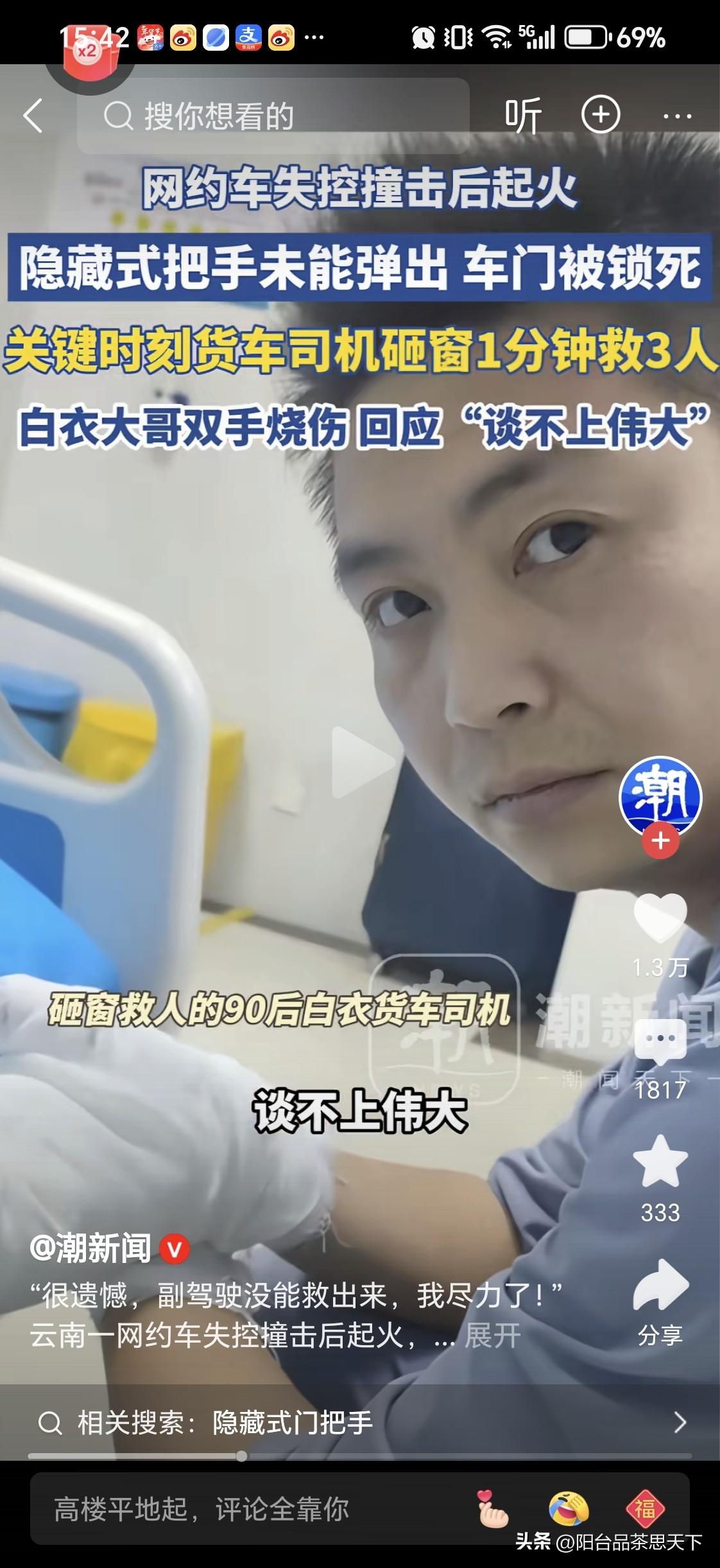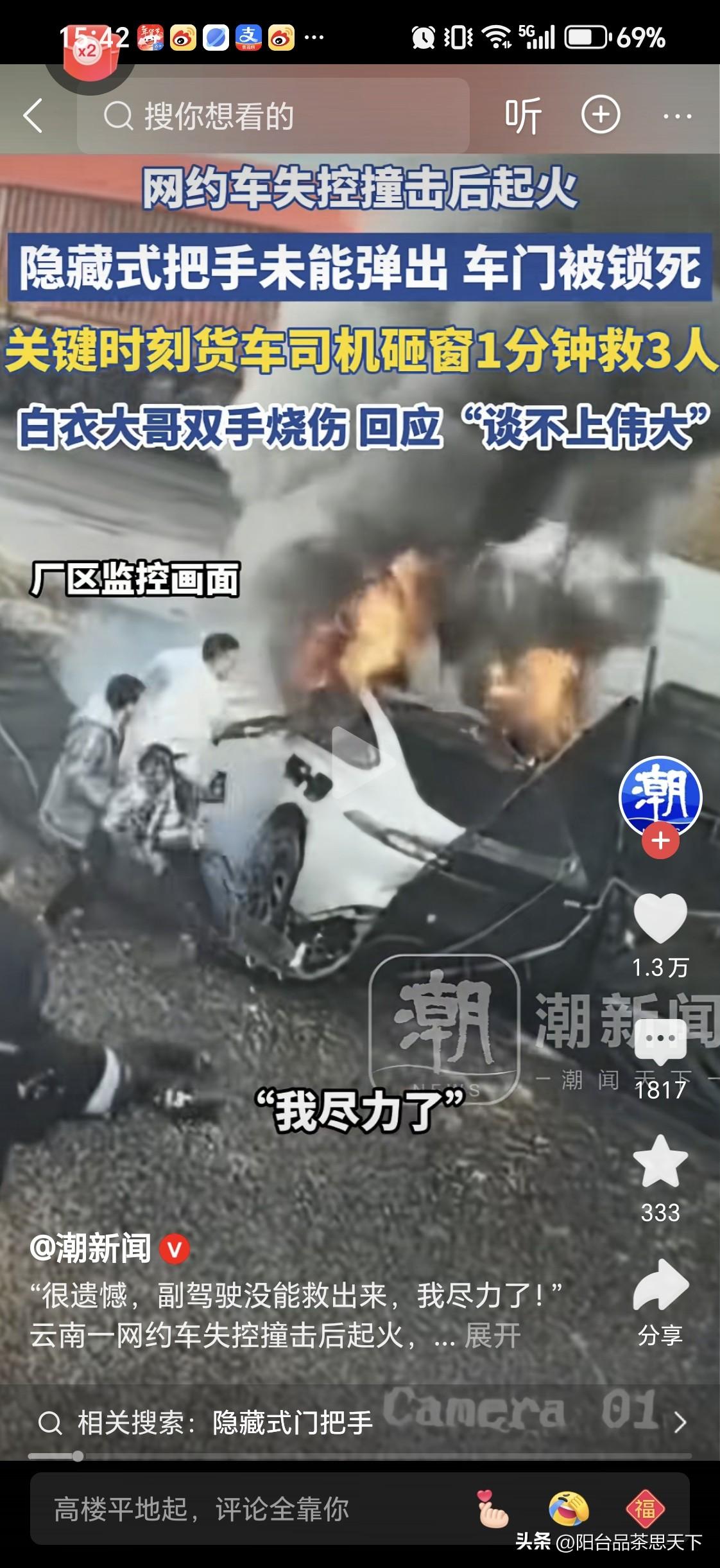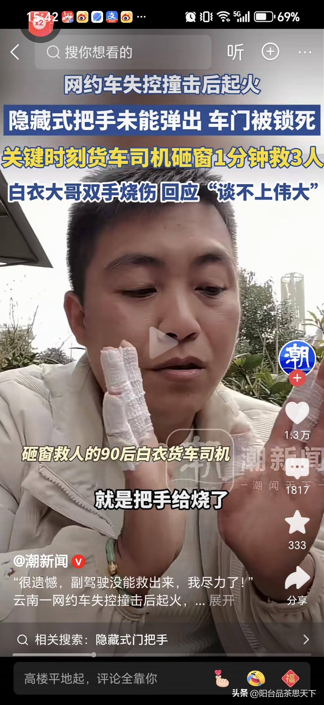 一分钟救出三条人命 积德之人,必有余庆 据官媒报道,云南某地一电动车出发生碰撞后着火,路过的大货车司机,迅速用大石头砸开玻璃窗,一分钟之内救出三人,自己的双手造成身体受伤! 救人司机表示很遗憾副驾驶的那一位没有救出来! 发生车祸后,车辆隐藏式把手未被弹出,车门被锁死!