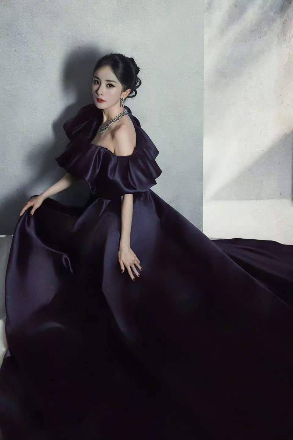 杨幂紫色缎面长裙杨幂红底鱼嘴高跟鞋 哇杨幂这套绝对是气势上的绝杀!杨幂
