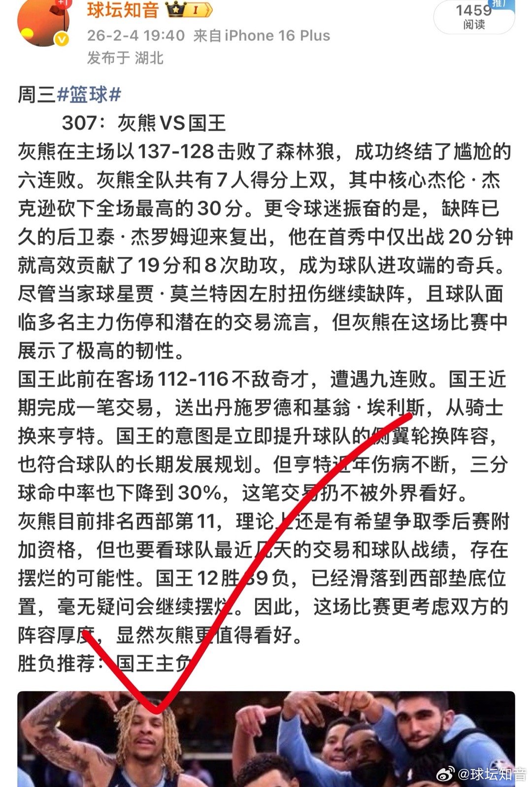 周三篮球 307:灰熊VS国王 灰熊在主场以137-128击败