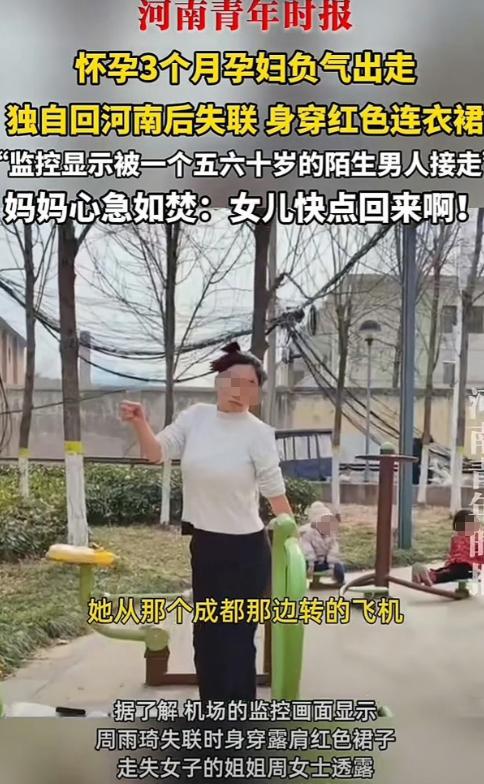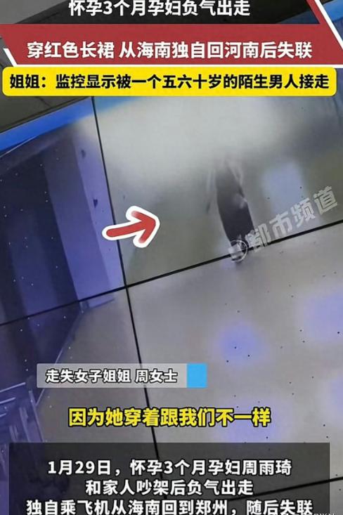 一怀孕3个月的女子在海南旅游时和家人吵架,赌气独自回郑州,家人找不到她后赶忙报了警,民警发现女子衣着单薄的到了机场,随后一50岁戴鸭舌帽男子出现,女子主动跟着上车后消失,女子家人根本不认识该男子,女子妈妈称女儿性格内向几乎不出门,不可能和这么大岁数的陌生男子来往,如今女子去向成谜。    近期一名怀孕3个月的女子,和家人在海南旅游时发生争执,一时赌气独自返回郑州,后续竟被陌生男子接走,至今去向成谜,每一个细节都让人无比揪心。 事发不久前,这名郑州女子跟着家人前往海南旅游,原本是一场放松身心的家庭出行,却没曾想,旅途中的一场争吵,打破了所有平静。 孕期女子情绪本就敏感易波动,加上旅途疲惫,一点小事便与家人闹了矛盾,争执之下,她一时气急,没跟家人打招呼,就悄悄做了返程的决定。 她匆匆购买了从海南返回郑州的机票,出发时格外仓促,身上只穿了一身单薄的衣物,连行李都没来得及携带,显然是临时起意,丝毫没考虑到郑州当下的寒冬天气。 彼时海南暖意融融,而郑州气温偏低,寒风凛冽,这身单薄装扮,让她后续出现在机场时,显得格外突兀。 另一边,家人发现女子不见后,瞬间慌了神,四处寻找无果,心急如焚的他们,来不及过多耽搁,立刻收拾东西从海南赶回郑州,抵达后第一时间报警,恳请民警帮忙寻找怀孕的女子,生怕她和腹中胎儿出现意外。 民警接到报警后,迅速展开调查,调取了郑州机场及周边的监控录像,一步步梳理女子的行动轨迹,很快便找到了女子的身影。 监控显示,女子抵达郑州机场后,身着单薄衣物站在出口附近,白皙的脸庞被冻得泛红,与周围穿着厚重棉衣、羽绒服的旅客形成鲜明对比,格外显眼。 就在女子独自站在机场、显得有些无助时,一名50岁左右的男子走上前,该男子头戴鸭舌帽,穿着朴素,身形中等,看上去十分普通。 两人简单交谈了几句后,让人意外的是,女子没有丝毫防备,主动跟着这名男子离开了机场,坐上了对方驾驶的车辆,随后车辆驶离机场,渐渐消失在车流中。 民警顺着车辆行驶轨迹继续追踪,发现这辆车最终驶入了一片老旧居民区,车辆在居民区的小巷中穿梭片刻后,拐进了一条没有安装监控设备的巷子,此后便再无踪迹,女子和那名陌生男子也彻底失去了消息。 女子的母亲在接受民警询问时,几度红了眼眶,满是担忧与自责。她坦言,女儿性格十分内向,从小就没离开过家人, 几乎不怎么独自出门,就连独自乘坐公交车的次数都屈指可数,完全没有独立生存的能力,更不可能主动和这么大岁数的陌生男子来往。 据悉,截至2026年2月初,民警仍在持续推进调查工作,重点排查老旧居民区的相关线索,走访周边居民,核实陌生男子的身份及车辆信息,全力寻找失联孕妇的下落。 女子失联的消息曝光后,也引发了全网热议,网友们纷纷猜测男子的身份,以及女子失联的背后是否另有隐情。 怀孕3个月本就是需要悉心照料的阶段,女子身着单薄衣物,又跟着陌生男子失联,既让人担心她的人身安全,更揪心腹中胎儿的安危。家人日夜期盼着女子能平安归来,全程四处奔波寻找,只是始终没有收获有用的线索。 目前,关于女子与家人发生矛盾的具体导火索,尚未有详细消息,陌生男子与女子的关系也无从知晓,这场看似因家庭争吵引发的失联事件,背后藏着太多未知。 所有人都在期盼,这名任性的孕妇能够平安出现,也希望警方能尽快抽丝剥茧,还原事件真相。 对此,你们有什么看法,欢迎评论留言~