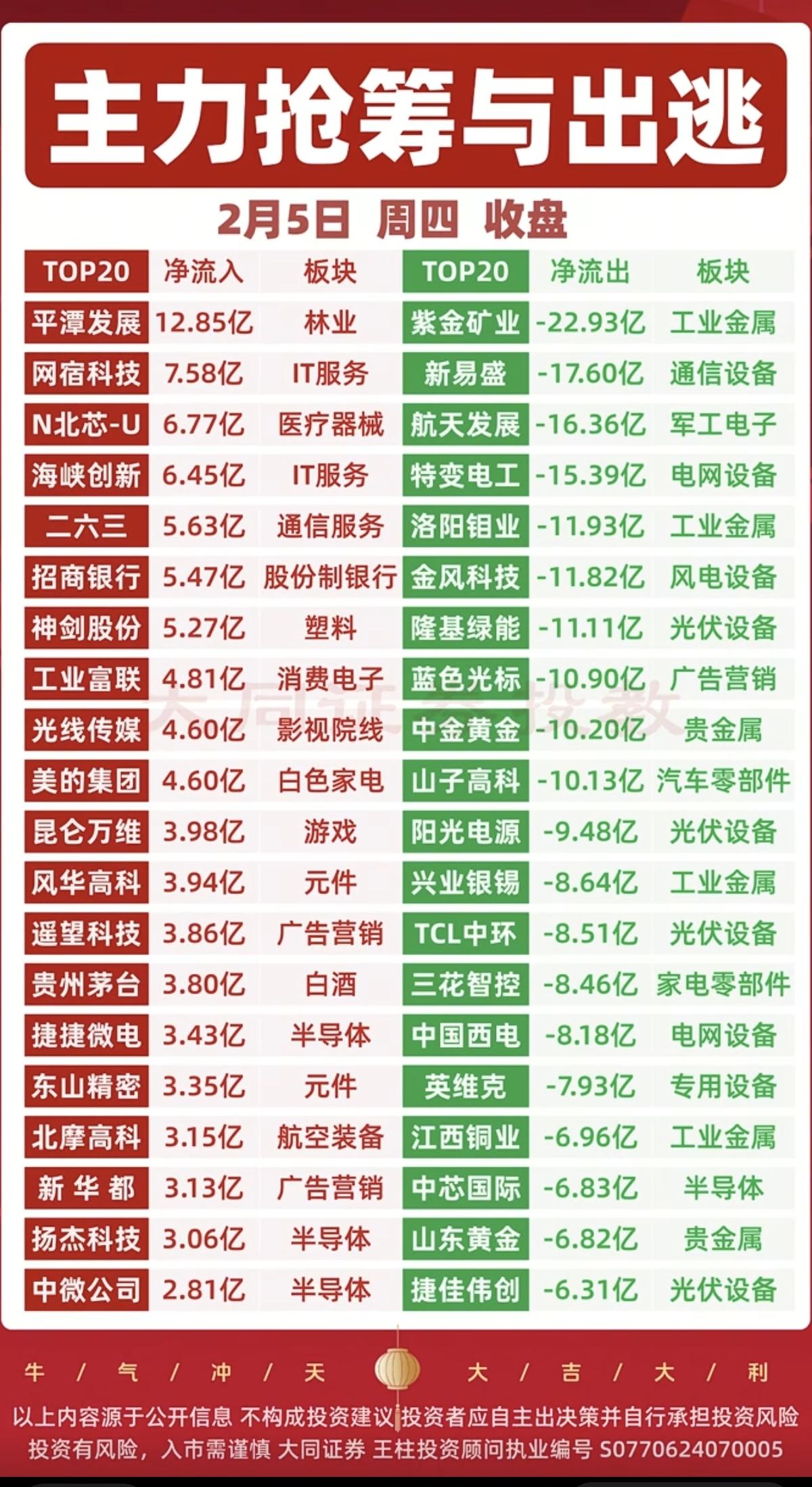 2.5周四 主力大资金 动向追踪监测! 资金 抢筹热点: 1.消费美容 2.食品饮料,乳业 3.房地产,化工 4.纺织,文化传媒 5.影视院线 资金出逃:稀缺资源、电池相关、磷化工、小金属等