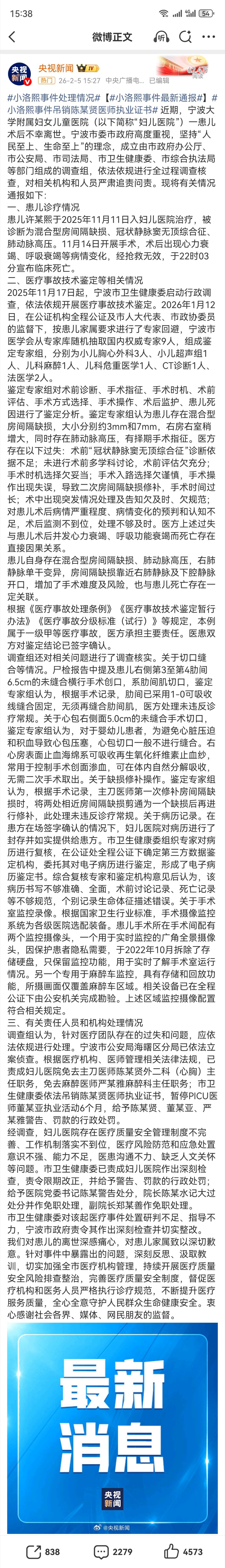 小洛熙事件最新通报来了!个人觉得这次官方通报非常客观,严谨,赞一个!2月5日宁波通报,小洛熙事件被认定为一级甲等医疗事故,医方负主要责任 。2025年11月,5月龄患儿许某熙心脏手术后离世,鉴定确认医方术前评估、手术操作、术后监护等存在过失,与死亡有直接因果关系。主刀医师被吊销执业证书,医院院长等被免职,多名人员受处分,警方已立案侦查。小洛熙事件最新通报