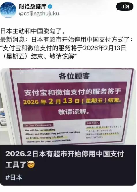 日本主动和中国脱钩了!部分日本超市发通告表示从2月13日起停用支付宝微信,现在日本已经在错误的道路上越走越远。 这件事看起来是商业操作,背后却藏着更深层的经济和政治原因。日本社会对移动支付的态度一直比较矛盾,一方面想拥抱新技术,另一方面又放不下原有的习惯和顾虑。 日本人的支付习惯和我们有很大不同,他们非常看重隐私保护,担心使用第三方支付会泄露个人消费记录等敏感信息。日本成年人平均每人拥有2.6张信用卡,信用卡支付环境已经相当成熟。不少日本人甚至更习惯用现金,觉得这样更容易控制预算。 正是在这种背景下,像PayPay这样的本土支付平台迅速崛起。软银集团投入大量资金进行市场推广,通过补贴和优惠活动吸引用户。目前PayPay用户数量已突破6000万,在二维码支付市场占据约三分之二的份额。 支付宝和微信支付进入日本市场的时间其实很早,2015年支付宝就开始在日本布局,主要服务于当时爆买的中国游客。到2017年底,日本已有4.5万家商户接入了支付宝,覆盖了主要零售商、连锁餐厅和大城市机场。当时很多商店为了吸引中国游客,店员都会用中文说“我扫你”。 但疫情导致中国游客数量锐减,支付宝和微信支付在日本的业务受到很大影响。随着2024年以来中国游客逐步回归,这些支付平台的使用率又开始回升。数据显示,支付宝在日本的商户网络已扩展到300多万家,2025年前三个季度活跃用户数增长了2.6倍。使用场景也从购物扩展到了餐饮、住宿、美容等多个领域。 然而部分日本超市在这个时候依然选择停用支付宝和微信,不能简单看作商业决策,这背后有着复杂的政治经济因素。近年来,日本政府积极推动所谓“经济安保”政策,强调要减少对中国的经济依赖。高市早苗内阁上台后,进一步强化了这一政策方向,筹备建立类似美国外国投资委员会的机构,加强对外国投资的审查。 日本政府推动的“去风险”策略在工商界引起了不同反应,一些日本企业担心,过度依赖中国市场或中国技术会带来风险。但更多企业界人士认为,与中国“脱钩”既不现实也不明智。日本国际贸易促进协会的泉川友树指出,与中国“脱钩”等同于让日本失去最重要的海外市场。东京大学教授丸川知雄也算过一笔账:如果日本真的与中国切断经济联系,日本GDP将损失10%,相当于53万亿日元。 从数据来看,中日经贸关系依然紧密。中国长期是日本最大的贸易伙伴,两国贸易额在疫情背景下仍创下历史新高。日本企业对华投资也在增长,2025年1-9月,日本实际对华投资同比大幅增长55.5%。 在更广阔的层面上,日本面临一个战略选择:是继续追随美国主导的“去风险”政策,还是在亚洲地区寻求更加平衡的外交策略。美国近年来试图组建排除中国的供应链联盟,但日本经济界清楚,中国市场的重要性无法替代。正如日本经团联会长十仓雅和所言,日本不应在竞争与合作中二选一,而应在竞争与合作中保持交往。 支付不仅仅是一个技术问题,更是经济互联互通的象征。银联在日本的经历或许能提供一些启示。2025年4月,银联与日本瑞穗银行合作,使超过百万家商户支持银联二维码支付。这种合作模式成功地在中国支付系统和日本金融体系之间架起了桥梁。 这些支付平台的进退变化,实际上反映了中日经济关系正在经历的调整期。随着RCEP的推进,中日两国在区域经济一体化中仍有广阔合作空间。日本需要中国市场,中国也欢迎日本投资。支付系统作为经济往来的基础设施,其开放与互联互通对双方都有利。 在当前复杂的国际形势下,中日经贸关系可能会面临更多挑战,但两国经济的互补性和深度融合决定了“脱钩”不是可行选项。如何在这种复杂关系中找到平衡点,既保障经济安全,又不失合作机遇,是两国都需要思考的问题。