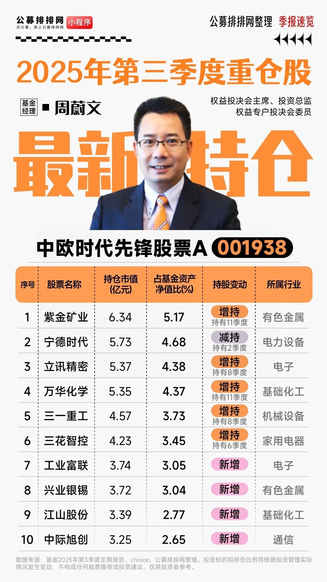 周蔚文最新持仓明细曝光!新进医疗、物流 私募排排网大佬持仓数据显示,近日,由周蔚文和罗佳明共同管理的中欧时代先锋股票A披露2025年四季报。 在《中欧时代先锋股票型发起式证券投资基金2025年第4季度报告》中,基金管理人提到,报告期内我们重点围绕以下两条主线进行布局: 一是由于流动性改善及供需平衡改善带来的价格见底或上涨的产业机会。我们重点关注因供给约束或需求复苏而步入景气上行周期的行业。 例如,电解铝行业由于扩产受限,未来1-2年全球产能预计维持紧平衡状态,而上游氧化铝因产能过剩导致价格持续下跌,叠加美联储降息周期对大宗商品的流动性支撑,我们在四季度增加了电解铝行业的配置。 储能行业同样受益于明确的产业趋势,其产能利用率已处于高位,随着独立储能模式的全国推广,未来两年国内储能需求有望持续向好,我们也相应增加了对储能产业链相关股票的配置。 二是以AI为代表的新兴产业趋势性机会。人工智能产业链一直是我们今年重点布局的方向。 本季度在综合考量当年市场风格表现、科技板块的持仓拥挤度、估值水平等多重因素后,我们小幅调降了该板块的整体配置比例,并根据不同细分行业的景气变化及相关公司的市值波动,适时进行一些结构的微调。 我们将主要仓位集中于盈利逻辑清晰、确定性较高的海外算力环节,同时继续降低下游需求不确定较高和产业化进展波动较大的部分AI应用领域的投资比例。 此外,我们也关注到保险行业的负债端成本正随预定利率下调而降低,资产端投资收益向好,有助于缓解利差损担忧,叠加板块估值处于较低水平,我们认为其当前也是较好的配置时点。