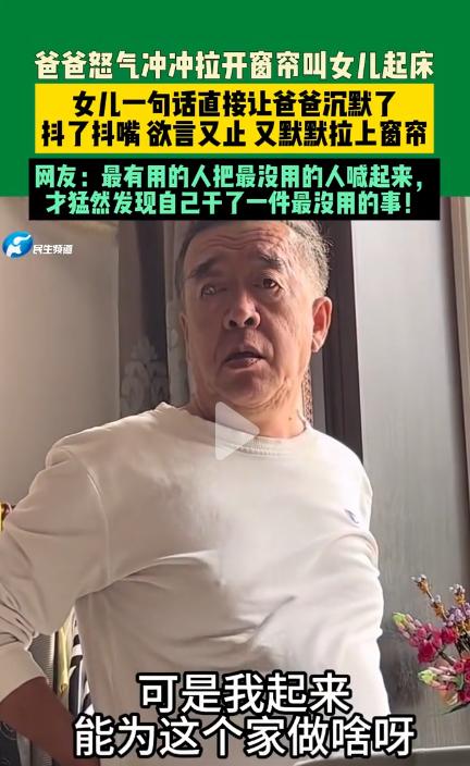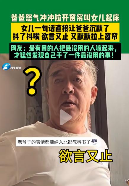 2月4日,辽宁一爸爸怒气冲冲拉开窗帘叫女儿起床,女儿一句话直接让爸爸沉默了,抖了抖嘴欲言又止又默默拉上窗帘。网友:最有用的人把最没用的人喊起来,才猛然发现自己干了一件最没用的事! 2月4日,辽宁一户普通家庭里,上演了一幕既搞笑又真实的日常,刷爆全网。一位爸爸看不惯女儿睡懒觉,怒气冲冲冲进房间拉开窗帘催她起床, 没曾想,女儿一句灵魂反问,直接让爸爸瞬间沉默,张了张嘴欲言又止,最后竟乖乖拉上窗帘,灰溜溜退场,网友的吐槽更是精准戳中笑点。 事发当天上午,太阳已经升起,透过窗户洒进院子,可辽宁这名女孩的房间里,依旧拉着厚厚的窗帘,屋内漆黑一片,丝毫没有要起床的迹象。 女孩放假在家,彻底开启了“睡懒觉模式”,哪怕已经醒了,也赖在被窝里刷手机,迟迟不愿下床,把悠闲刻进了骨子里。 爸爸收拾完家务,路过女儿房间时,看到屋里依旧黑漆漆的,瞬间没了耐心,一股火气涌上心头。他觉得女儿太过懒散,大好时光都浪费在睡懒觉上,既不利于作息规律,也显得不够自律,越想越气,索性怒气冲冲推开女儿的房门,大步走到窗边。 没有多余的叮嘱,爸爸一把抓住窗帘,狠狠往旁边拉开,刺眼的阳光瞬间涌入房间,照亮了整个屋子,直直洒在女孩的床上。 他本以为,阳光一晒,再加上自己的气势,女儿就算再赖床,也会乖乖爬起来,没曾想,接下来的一幕,彻底超出了他的预料。 被阳光晃到的女孩,没有丝毫慌乱,也没有表现出愧疚,只是慢悠悠地翻了个身,眯着眼睛看向怒气冲冲的爸爸,语气平淡地抛出一句灵魂拷问,没有丝毫怯意。 就是这句话,让原本怒气满满的爸爸,瞬间僵在原地,脸上的怒火瞬间消散,取而代之的是一脸错愕。 他张了张嘴,像是想反驳,想继续催促女儿起床,可话到嘴边,又硬生生咽了回去,反复斟酌后,竟发现自己无从反驳。 愣在原地几秒后,爸爸没了往日的强势,眼神渐渐变得无奈,甚至带着一丝窘迫,抖了抖嘴,最终什么也没说,默默走上前,把拉开的窗帘又重新拉了回去,轻轻带上房门,悄悄退场,全程没再发出一点声响。 这一幕被刚好路过的家人拍下,发布到网上后,快速走红,瞬间引发全网热议,承包了大家的笑点。 近年放假期间,“家长催起床”成为高频亲子互动名场面,相关话题多次登上热搜,每一次都能引发大量网友共鸣,藏着最真实的家庭烟火气。 不少网友看完视频后,纷纷留言吐槽,精准拿捏了其中的笑点,有网友直言“最有用的人把最没用的人喊起来,才猛然发现自己干了一件最没用的事”,一句话戳中要害,引发无数人附和。 还有网友分享自己的同款经历,坦言“我爸也是这样,天天催我起床,我一问他我起来干啥,他就没话说了”“放假在家的我,和这个女孩一模一样,赖床就是我的日常”;也有网友调侃“爸爸这是搬起石头砸自己的脚,气场全被女儿一句话拿捏了”。 其实,这样的小插曲,在很多家庭里都在上演。家长总想着让孩子养成规律作息,看不惯孩子懒散赖床,满心都是为了孩子好;可在孩子眼里,放假就是用来放松的,赖床是难得的惬意,两者的想法碰撞,就酿成了这样的搞笑名场面。 没有激烈的争执,没有严厉的指责,只是一句简单的反问,一场强势的催促,就以爸爸的“妥协”落幕,藏着亲子间最真实的温情与默契。 比起生硬的管教,这样的小互动,反而让家庭氛围更显温馨,也成为放假期间最难忘的日常碎片。 对此,你们有什么看法,欢迎评论留言~