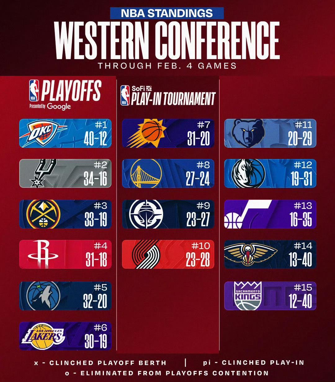 西部前三开始拉开分差,马刺逐步凸显冠军气质,今天主场击败雷霆就是最好的证明。 掘金客场加时不敌尼克斯,总感觉掘金缺乏一点运气。 森林狼险胜猛龙,排名反超湖人升至第五。湖人再度面临掉入附加赛区危险,第七的太阳与湖人一样胜场差。 快船再次溃败,排名稳居第9,想反超勇士有点难,开拓者想反超快船更难。