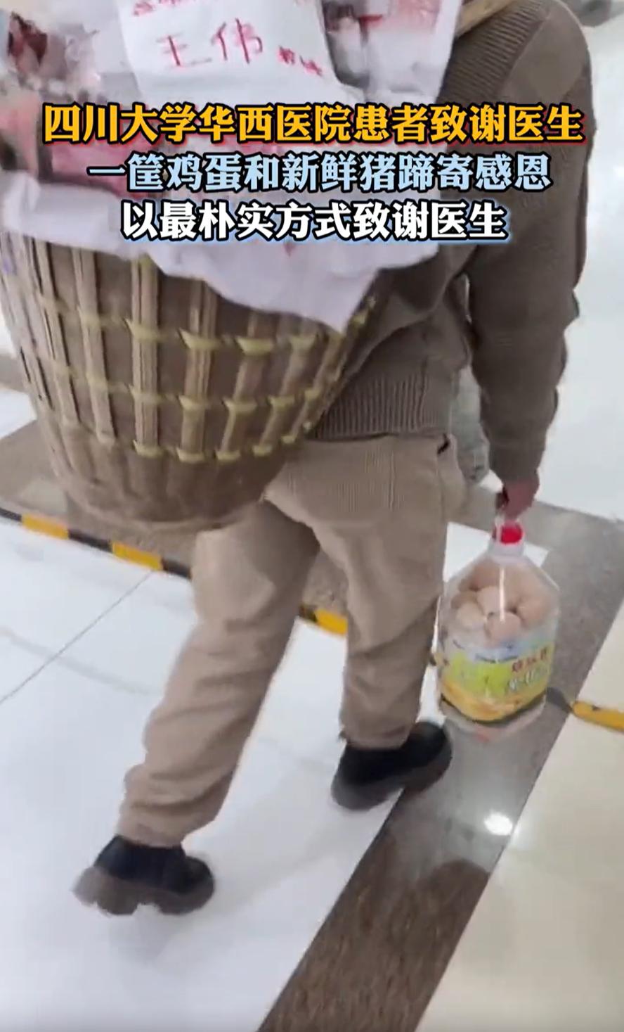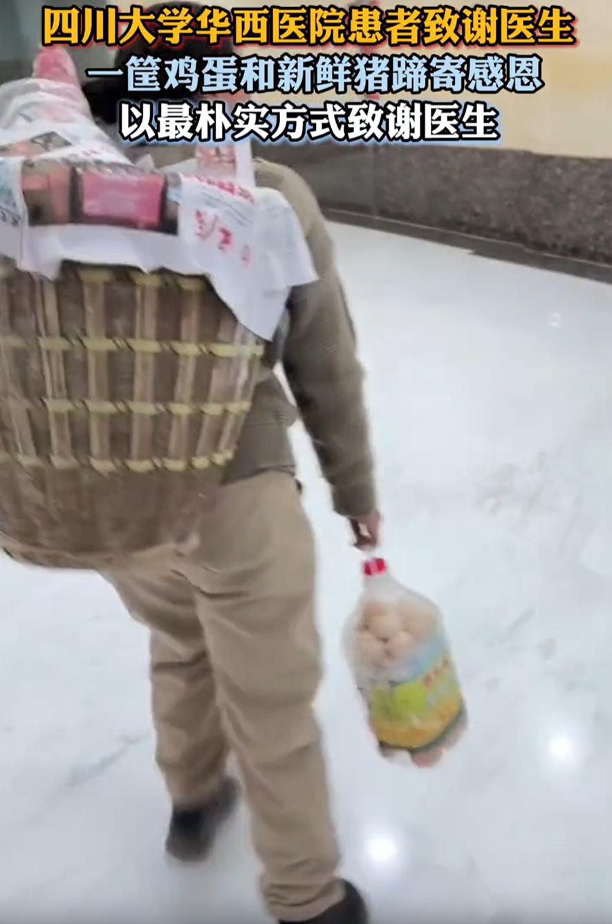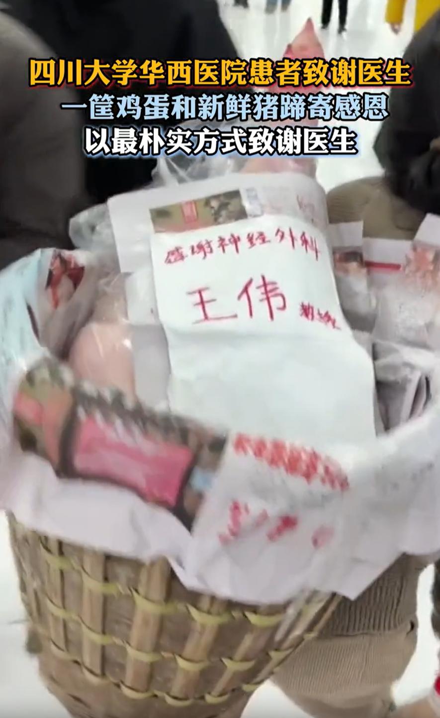 这种情况该不该接?四川大学华西医院,一位患者出院后不久又来了一趟,这一次是为了专门回来感谢医生的,不过她并不是给红包,而是拎了一筐鸡蛋和整整一个大猪蹄,网友:花钱都买不到 视频显示,这位患者背着一筐东西,除了一些土特产,还有一个完完整整的大猪蹄,上面贴着一张纸,是他手写的内容,感谢神经外科王伟教授,而他手上还拎着一桶鸡蛋 她说不出太多漂亮话,但心里一直惦记着要来表达感谢。在家里想了很久,最后决定带点自己有的东西,城里人现在讲究吃土鸡蛋,猪蹄炖汤也营养,都是实在的东西 或许从东西的价值来看,这些东西没有上万甚至几千,但却让不少人看的泪目 有网友说:金杯银杯不如老百姓的口碑,农民患者用最朴实无华的方式,感谢王伟教授(医生),充分说明了王教授是一位医术医德过硬的好医生 确实如此,其实在医院工作的人都知道,患者表达感谢的方式有很多种。送锦旗的不少,写感谢信的也有,送水果篮、送特产的都是常见的事。但像这样从家里带土鸡蛋和猪蹄的,往往是那些从农村或小城镇来的患者 对他们来说,这些不是超市里随便能买到的东西。土鸡蛋是家里养的鸡一天天下的,要攒一段时间才能攒够一筐。猪蹄是过年杀猪时特意留下的,平时舍不得吃。这些东西带着生活的温度,也带着他们最质朴的价值观,把最好的东西送给帮助过自己的人 所以,回到最初的问题——这种情况该不该接?我的回答是,应该接,且非常值得接。这种来自患者的感谢并没有任何形式的压力,反而是一种最真诚、最接地气的回馈。医生用自己的专业能力和人格魅力,获得了患者的尊重与信任。而患者则用最简单、最实在的方式,将这种感激传递出去