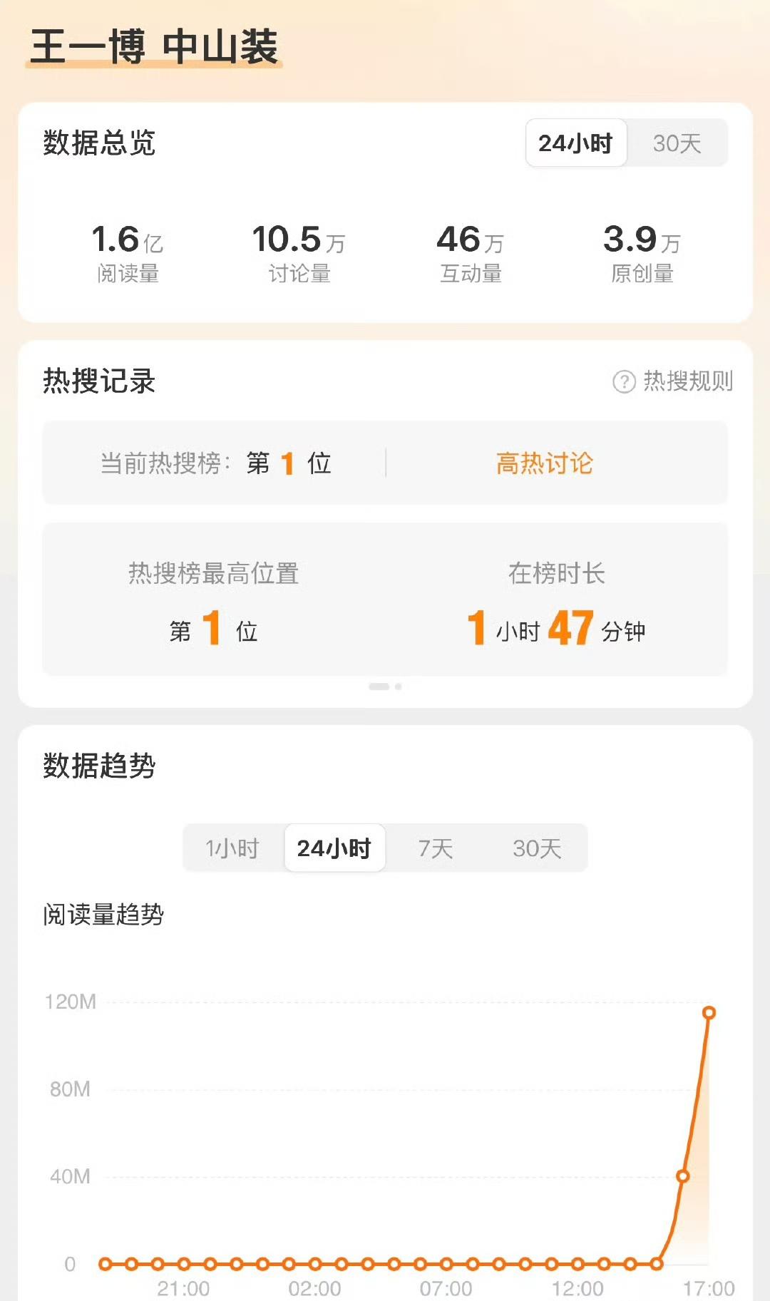 时尚的王者,红毯的“神”,真巨星——王一博。 王一博中山装踏上红毯,瞬间引爆热搜,话题阅读火速破亿,vb双榜热一、爆!泰趋登顶包揽前二,世趋第四第六。 真巨星风采,真国民度爆棚,万众瞩目,便是如此。 王一博 王一博中山装