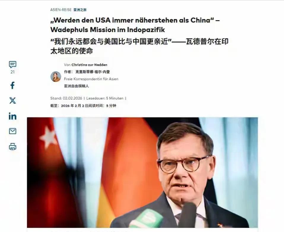 德国外长访问新加坡时说:永远跟随美国,不管我们如何受虐,也绝不会转投中国!   2月2日,德国外长瓦德富尔在新加坡的公开活动上,没有丝毫外交辞令的迂回,直言不讳地亮明了德国的这一立场。   作为欧洲的核心大国,德国本该有自己独立的外交判断,却如此斩钉截铁地宣告要依附美国,哪怕被美国处处打压、受尽委屈,也不肯正视与中国的深厚合作情谊,实在令人费解又惋惜。   瓦德富尔此次访问新加坡,是他上任8个月来第四次到访印太地区,频率之高实属罕见,而他在活动上抛出这番表态,核心就是向美国“表忠心”,哪怕美国在贸易、防务上一直对德国施压,德国也不会有任何动摇,更不会转向中国。   最让人觉得矛盾的是,瓦德富尔嘴上说着“不管如何受虐”,却偏偏主动选择继续被美国牵制,甚至无视美国对德国的实际伤害。   这些年,美国对德国的打压从来没有手软过,就拿2025年来说,美欧贸易摩擦升级,美国单方面对德国汽车加征高额关税,直接让德国汽车产业损失超过百亿欧元。   要知道汽车产业是德国的经济支柱,无数人靠着这个产业谋生,这份“虐”可不是嘴上说说,而是实实在在的经济损失。   除此之外,美国还一直逼着德国增加北约军费,要求德国将军费提升到本国GDP的2%,这就意味着德国要拿出更多的钱投入军事,原本可以用来改善民生、发展经济的资金,不得不被动挪用,可即便如此,德国还是心甘情愿跟着美国走。   更讽刺的是,德国一边对着美国表忠心,宣称“绝不会转投中国”,一边又离不开中国市场的支撑,这种言行不一的做法,说白了就是自欺欺人。   公开数据显示,2025年中德双边贸易额仍超过2400亿欧元,中国已经连续多年是德国最大的贸易伙伴,德国很多知名企业的发展都离不开中国市场,不管是汽车、机械还是高科技领域,中德之间的合作都十分紧密。   德国对华出口占其总出口的7.8%,远超对美出口占比,要是真的因为盲目跟随美国,切断与中国的合作,德国的制造业、出口业都会遭受重创,到时候受损的还是德国自己和普通民众的利益。   瓦德富尔在新加坡说这番话的时候,新加坡外长维文就在现场,面对他这种偏执的表态,维文只冷冷回应了一句,过去80年的世界秩序已经明确结束了。   这句话的意思很明白,现在的世界早就不是单一国家说了算的时代,依附于某一个国家,放弃自身的战略自主,根本不是明智之举,可瓦德富尔显然没有听进去,依旧一门心思要抱美国的大腿。   其实德国国内现在也十分割裂,政治精英们一门心思认同西方阵营,觉得跟着美国才“踏实”,可国内的企业和民众却很清楚,与中国的合作关乎切身利益,不能轻易放弃,这种内部的矛盾,也让德国的外交政策陷入了尴尬的境地。   可能有人会觉得,德国跟着美国是为了寻求安全保护,毕竟俄乌冲突爆发后,德国一直有很强的安全焦虑,觉得只有依靠美国和北约,才能保障自身安全。   可事实并非如此,美国从来都是“美国优先”,根本不会真正顾及德国的利益,这些年美国在欧洲的种种做法,早就证明了这一点——让欧洲陷入能源危机、逼着欧洲承担俄乌冲突的大部分成本,而德国作为欧洲的领头羊,承担的损失最大。   相反,中国一直坚持互利共赢,从来没有干涉过德国的内政,也没有像美国那样打压德国的产业,反而一直是德国可靠的合作伙伴,可德国却偏偏无视这份诚意。   瓦德富尔的这番表态,看似是坚定的立场宣示,实则是放弃战略自主的妥协,更是一种短视的行为。这种“宁肯受虐也不转身”的做法,根本不是忠诚,而是对本国利益、对本国民众最不负责任的表现。