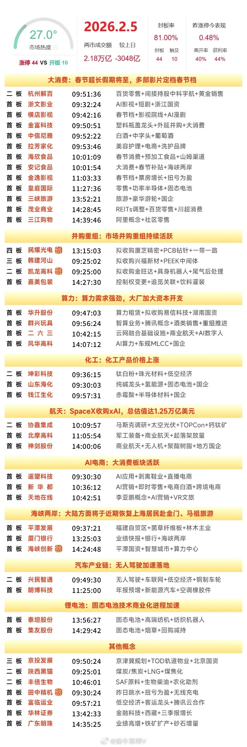 2月5日涨停复盘 | 大消费板块大涨,食品饮料、零售、影视院线、旅游酒店方向轮番活跃,大金融板块午后走强,商业航天概念局部活跃,算力租赁概念回暖