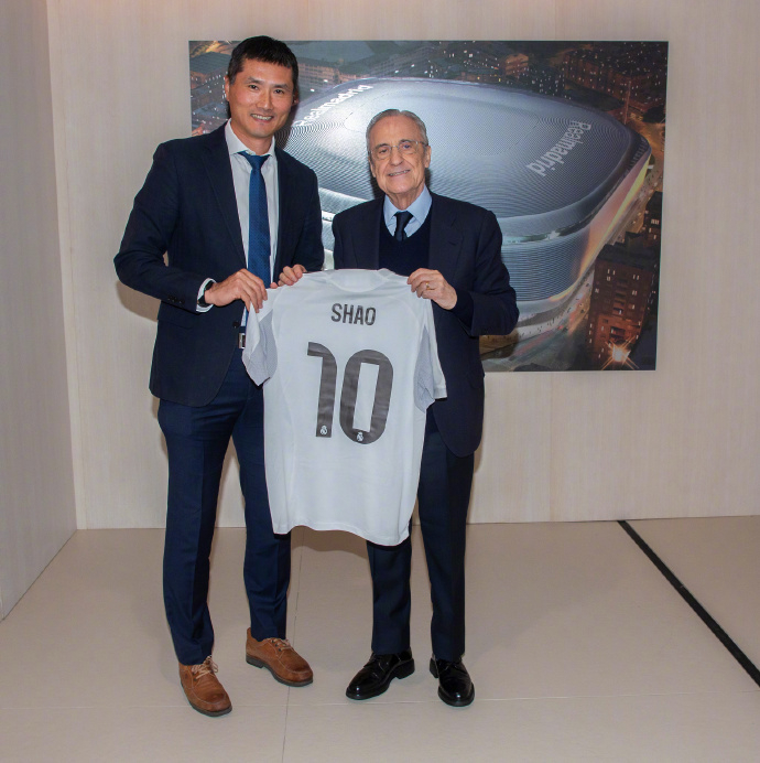 主席弗洛伦蒂诺·佩雷斯先生与邵佳一教练亲切会面并互赠球衣。邵佳一先生参观了皇马体育城,观摩了青年队训练,并与体能教练平图斯、医疗总监尼科·米希奇博士进行了专业交流。