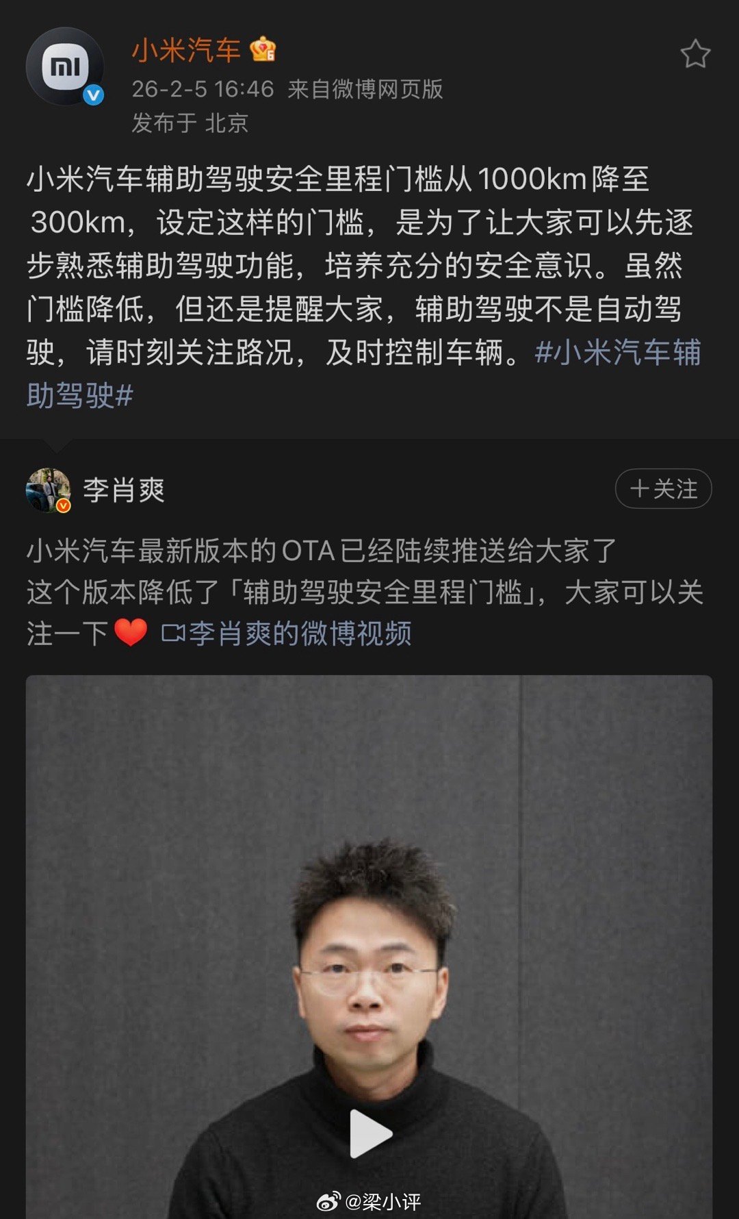 小米汽车重申辅助驾驶不是自动驾驶小米汽车提这个提了很多次了,反正开车吧,不管用不用辅助驾驶,都要专注点,安全第一不是开玩笑的,辅助驾驶功能要熟悉使用,掌握好边界,不能解放双手,让汽车它自己在路上开