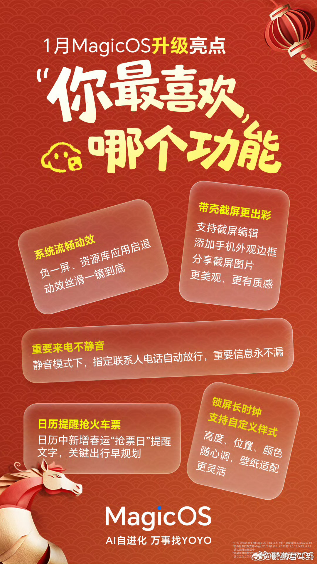 荣耀的Magic OS 在刚刚过去的1月升级了不少功能,不仅支持了带壳截图,还有日历提醒抢票的功能,正好春节能用上!