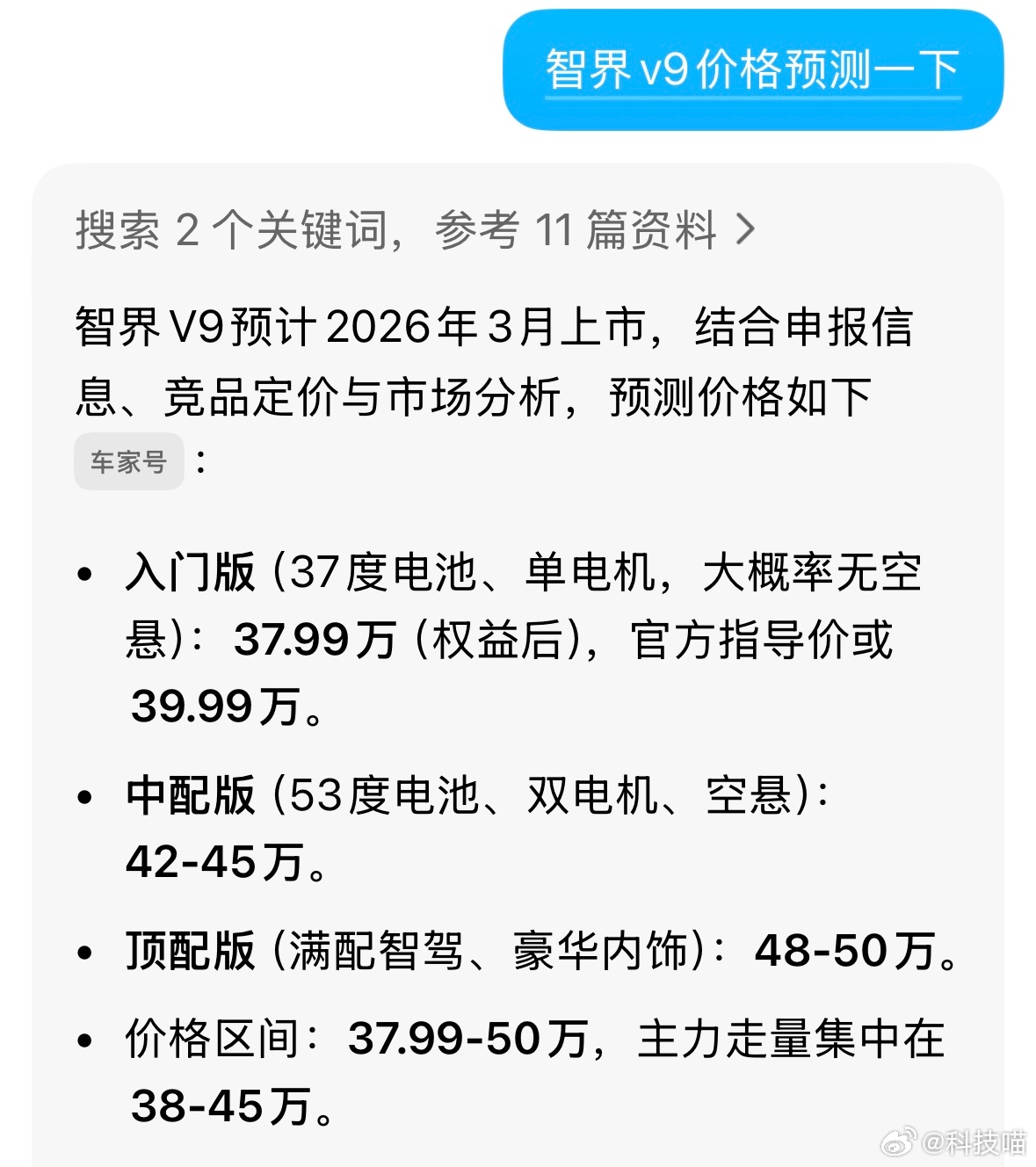这车卖多少钱起步比较合适?AI预测售价37.99–50万元。