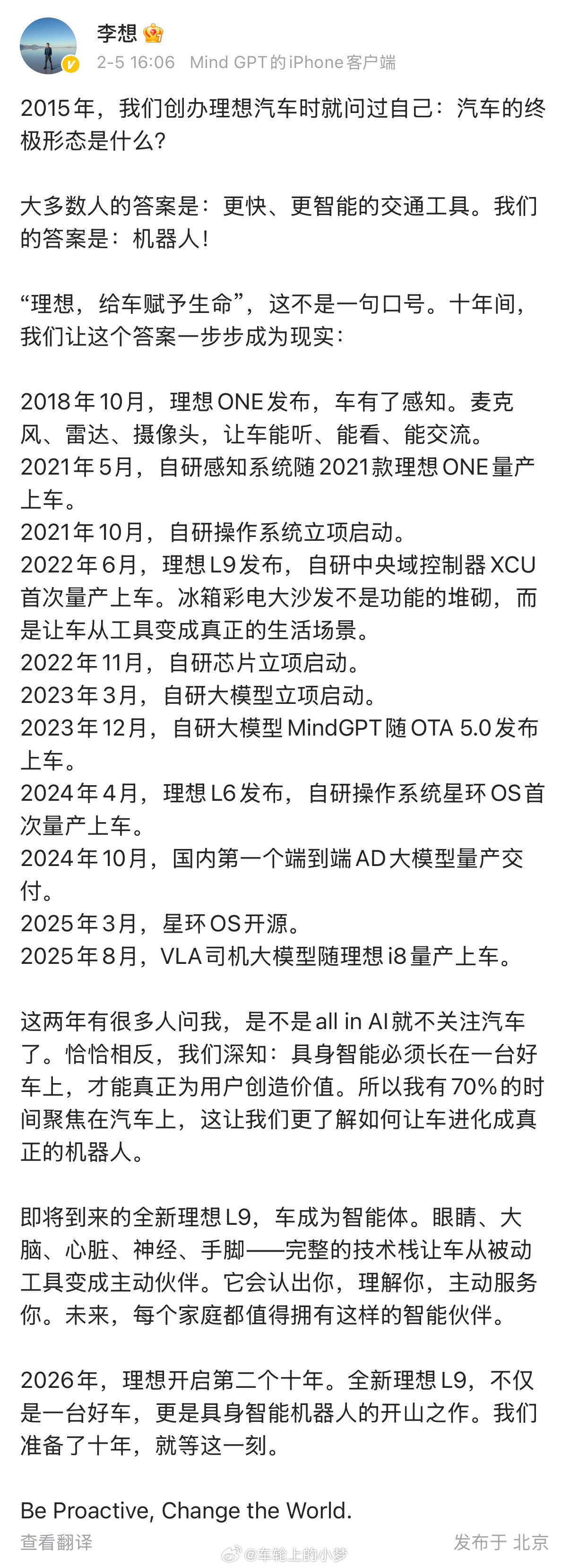 十年前有人猜它是机器人,现在看,还真不是瞎想!理想从造车第一天就在琢磨——怎么让车不只是代步工具。从能听会说的初代感知,到自研芯片、大模型一点点攒技术,就像给车慢慢装上“大脑”和“神经”。现在的车能认出你是谁,知道你想干啥,甚至提前帮你把空调调好、座椅摆舒服。
