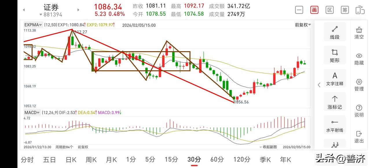 证券板块复盘(2026.2.5) 这二天,证券板块连续拉出了二根阳线,触底反弹的味道越来越浓,目前正在有条不紊的向上继续延伸,不管后面怎样回调,这里就是底部区间,这里的筹码值千金,即使后面你要尝试做高抛低吸,那也要按操作原则来处理,即自己的操作级别上只要没有走坏,那就要继续持股待涨。 1.从30分钟图一上看,目前正在向上反弹一笔,但还没有破中枢最高点(GG),所以在该级别上还不能确认反转,还要看明天5分钟上的走势。 2.从5分钟图二上看,今天的回调并没破A点,那么在5分钟上是没有走坏的,没有达到减仓的条件,下午构建了一个打压式的5分钟中枢后,强势向上突破,延续了30分钟一笔的上涨,目前在该级别上走势正常,有望继续向上延伸,当然你想做高抛低吸的话,防守位放在B点,如果跌破B点,可考虑减仓三成,没跌破可考虑继续持股待涨。 总体而言,此处触底反弹的概率很大,但股市走势千变万化,唯有一步步去做好应对才能防患于未然。证券板块动态 股票分析