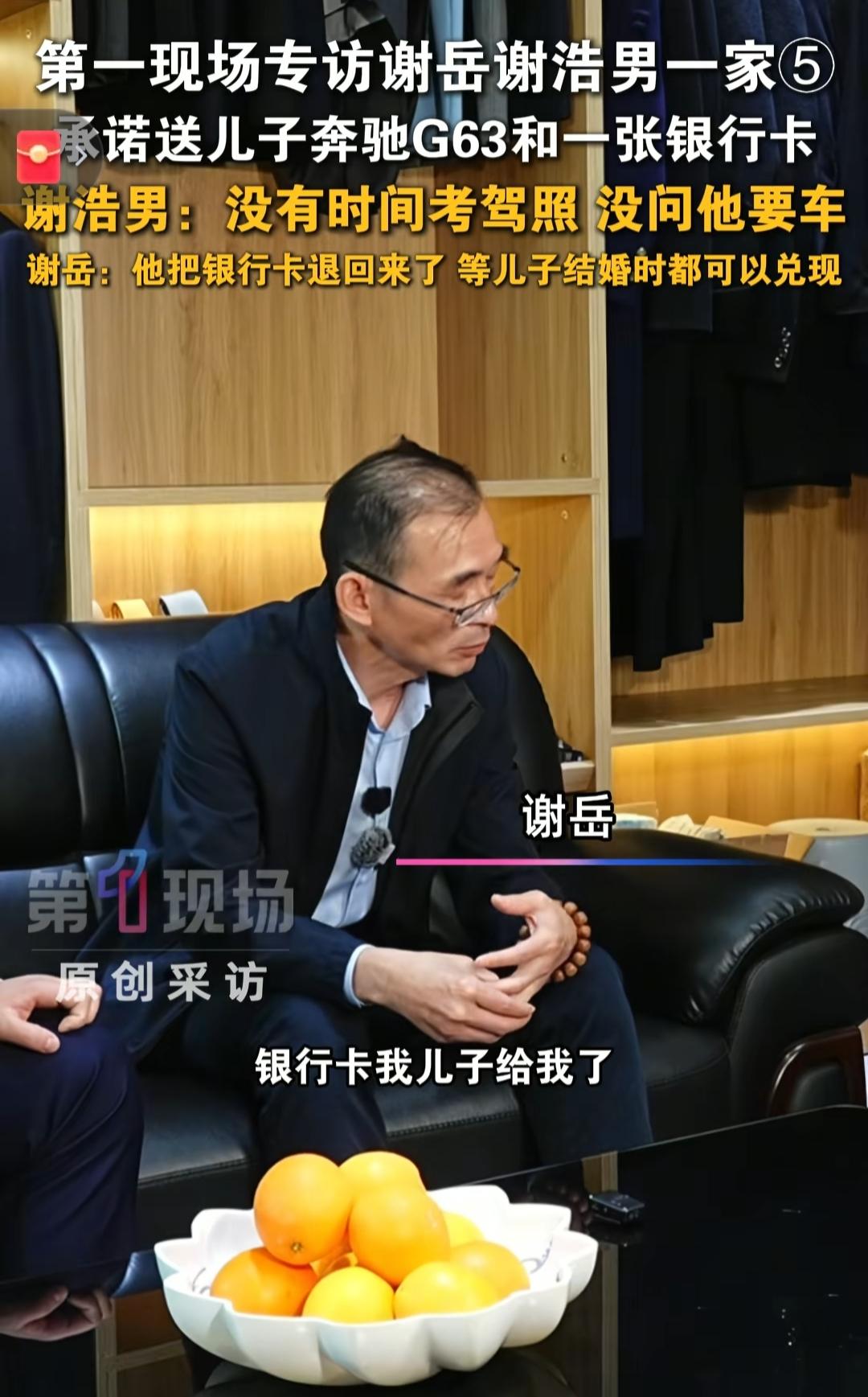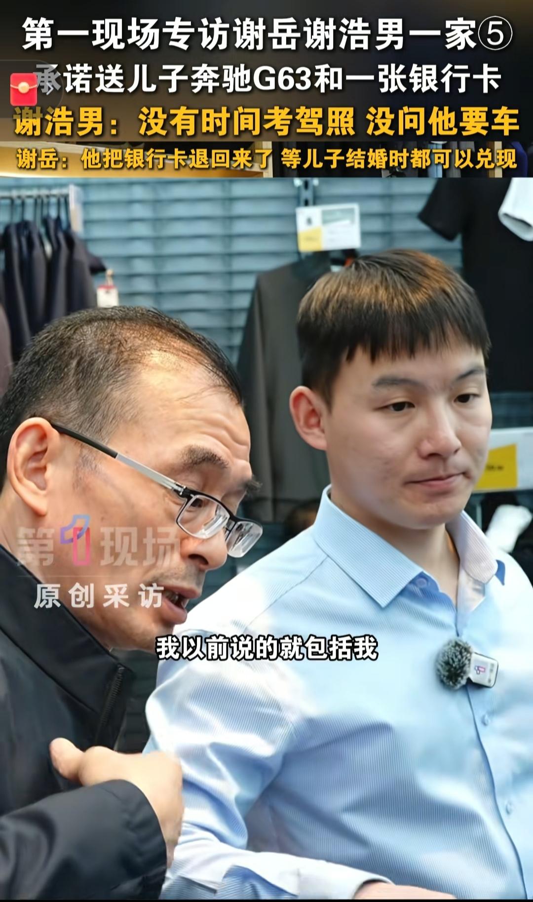 谢浩男试图不想把养父母的丑行暴露在网络上,他回应主持人,小时候过的怎么样不重要了,也算有情有义。但一句话又告诉网友,在养家过的不幸福!他说,跟原生家庭相处更加舒服。认亲还不到一年,就跟能相处这么好,还不够说明,养家对他不好吗?具体细节他自己不愿意多说了。 他真的是个宝藏男孩。有文化有修养,谈吐还好。谢爸爸太满意,对于儿子找对象,说是有文化的人会不一样。言语间,即使谢浩男说找对象没有特定要求,但是谢岳一定希望儿媳妇也是个有文化的人吧。 他把银行卡退回去给爸爸了,驾驶证没有考,也不需要车。大有自力更生的气魄 唯一的遗憾是,一家人差个妈妈就整整齐齐。这样的背影太有缺憾了!
