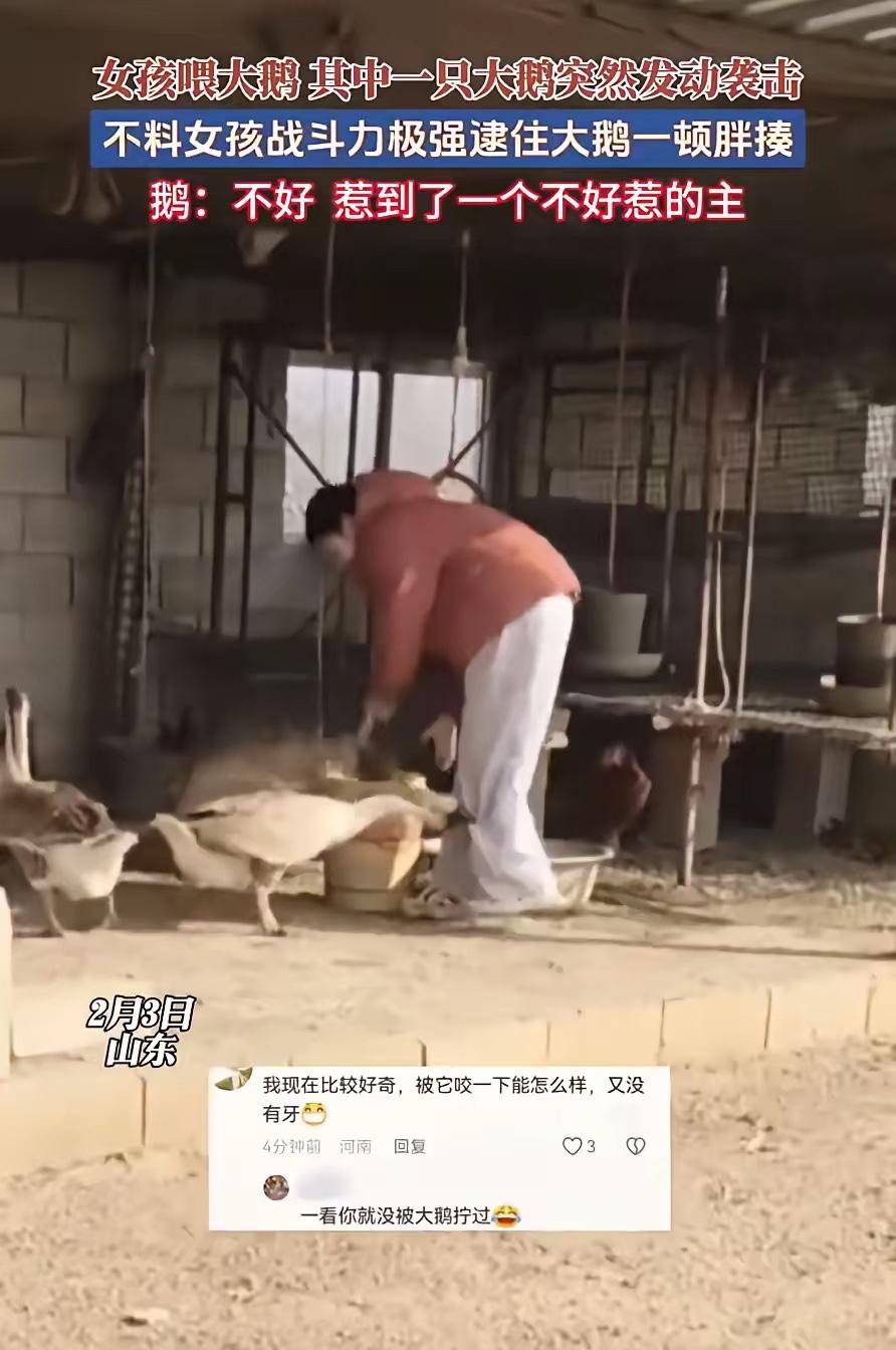 山东,一大学生放假回家,帮家里喂大鹅时,一只大鹅突然对女生发动袭击,没成想,女生不但没害怕,反而战斗力极强,直接把大鹅给打老实了,妈妈询问要不要把大鹅做掉,女生表示等把它打服再说。 视频显示,当天下午,女生提着饲料走向院子里的鹅圈,刚把饲料撒进食槽,一只体型壮硕的大鹅突然扑棱着翅膀冲了过来,伸长脖子对着她的小腿猛啄。毫无防备的女生被啄得一个趔趄,裤腿瞬间被啄出几道痕迹。 换做旁人,大概率会吓得后退或者尖叫,可这个女生反应极快,被啄的瞬间就稳住了身形,反手就攥住了大鹅的脖子,另一只手按住它扑腾的翅膀。大鹅还在拼命挣扎,脖子使劲扭动,翅膀拍打得尘土飞扬,女生却丝毫没松手,力气大得惊人,就这么把大鹅按在地上,直到它不再扑棱,乖乖缩着脖子不敢动弹。整个过程不过十几秒,女生全程面不改色,拍了拍手上的灰,还低头看了眼被啄的裤腿,一脸淡定。 妈妈在屋里听到动静跑出来,看到这一幕又惊又笑,赶紧问女儿有没有受伤,还随口说了句“这鹅太凶了,要不直接炖了吧”。女生摆了摆手,蹲下来戳了戳老实的大鹅,语气带着点不服输的劲儿,说不用急着做掉,非得把这只鹅打服了,让它知道谁才是家里的“老大”。说完还把大鹅拎起来晃了晃,大鹅耷拉着脑袋,连叫都不敢叫一声,彻底没了刚才的嚣张气焰。 这段视频被妈妈拍下来发到网上后,很快就火出了圈,评论区直接炸开了锅。不少农村网友都深有感触,说大鹅是“农村三霸”之首,领地意识极强,平时连狗都敢啄,很多大人都不敢轻易招惹,没想到被一个女大学生轻松拿捏。还有网友调侃,这女生是放假回家解锁了隐藏技能,战斗力直接拉满,大鹅这次算是踢到铁板了。也有网友分享自己被大鹅啄的经历,对比之下更觉得这个女生又飒又可爱。 其实在农村,大鹅看家护院的本事一直很出名,它们听觉灵敏,遇到陌生人或者觉得有威胁的对象,就会主动发起攻击,啄人、扇翅膀都是常用的手段。很多农户养鹅,除了卖鹅蛋、吃肉,更多是把它当成“活保安”,守护院子和家禽。只是这只大鹅没想到,平时在院子里横行惯了,遇到了一个不好惹的主,直接被收拾得服服帖帖。 女生的反应之所以让人觉得有趣,不仅是因为她的战斗力,更因为她的心态。没有因为被袭击而生气抱怨,反而生出了要“打服”大鹅的念头,这种接地气的互动,充满了农村生活的烟火气。放假回家的大学生,不再是校园里的学子,而是帮家里干活、和家禽斗智斗勇的普通孩子,这份真实和鲜活,也是视频能打动网友的原因。 妈妈的调侃和女生的回应,也透着浓浓的家庭温情,没有因为家禽的袭击产生矛盾,反而成了一家人的趣味谈资。平凡的生活里,这样的小插曲看似不起眼,却藏着最真实的快乐,也让我们看到了当代年轻人接地气、不矫情的一面。 各位读者你们怎么看?欢迎在评论区讨论。