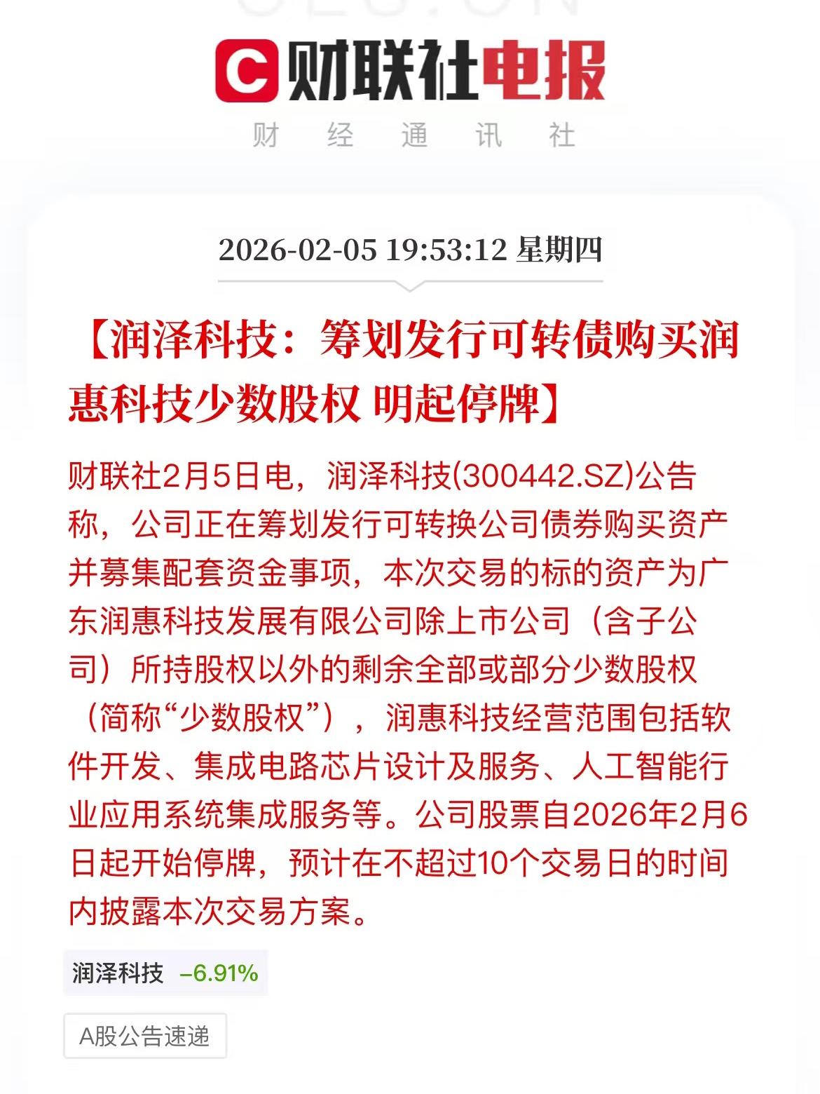【润泽科技:筹划发行可转债购买润惠科技少数股权明起停牌】 今天资金居然没拿先
