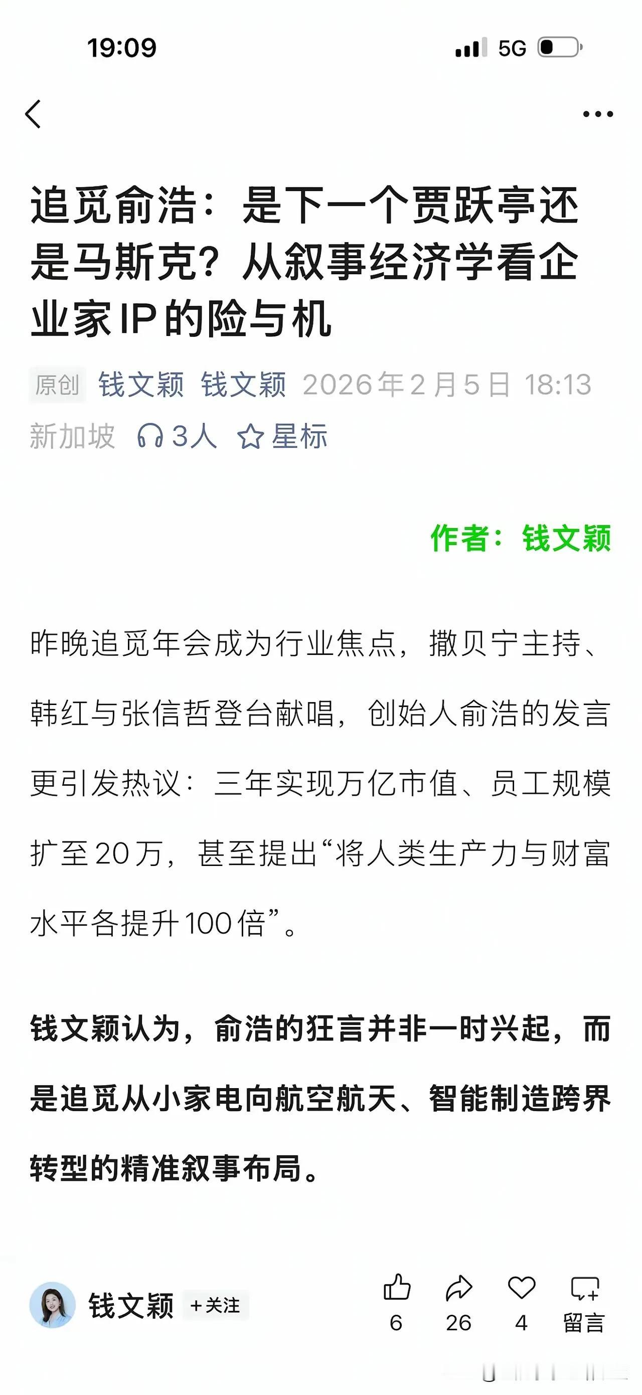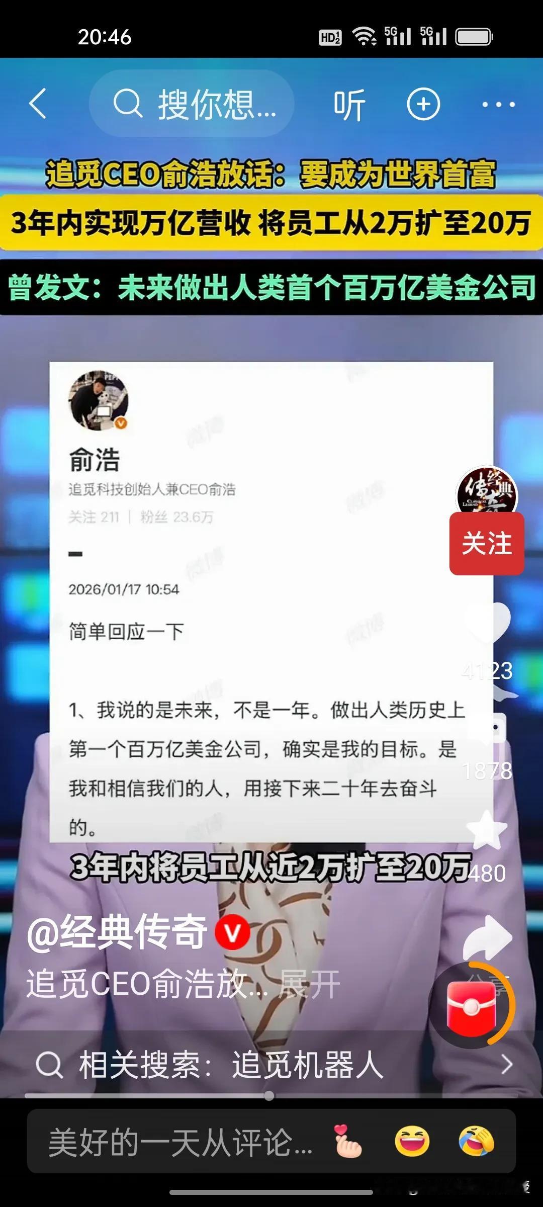刚刚看到,但斌给追觅CEO俞浩泼冷水了,说追觅凭现在的情况想当世界首富几乎不可能。他还认为中国文化就是主张谦逊低调,很明显,他认为追觅CEO俞浩在年会上的发言太高调了。 俞浩说未来要做出人类首个百万亿美金公司,三年内实现万亿营收。年轻人就是要有梦想,马斯克当年做梦也没想到他能成为历史上最富有的美国富豪。 年轻人心怀鸿鹄之志从无错处,敢喊出百万亿的目标,正是中国青年向世界展示的底气与锋芒。但梦想的落地,终究要靠一步一个脚印的实干。敢想敢说更要敢做,让昂扬斗志扎根在脚踏实地的拼搏里,才能让中国青年的梦想,真正照进现实。