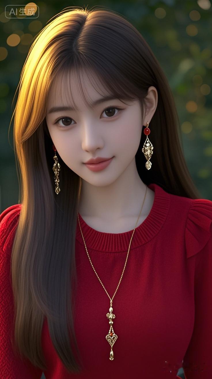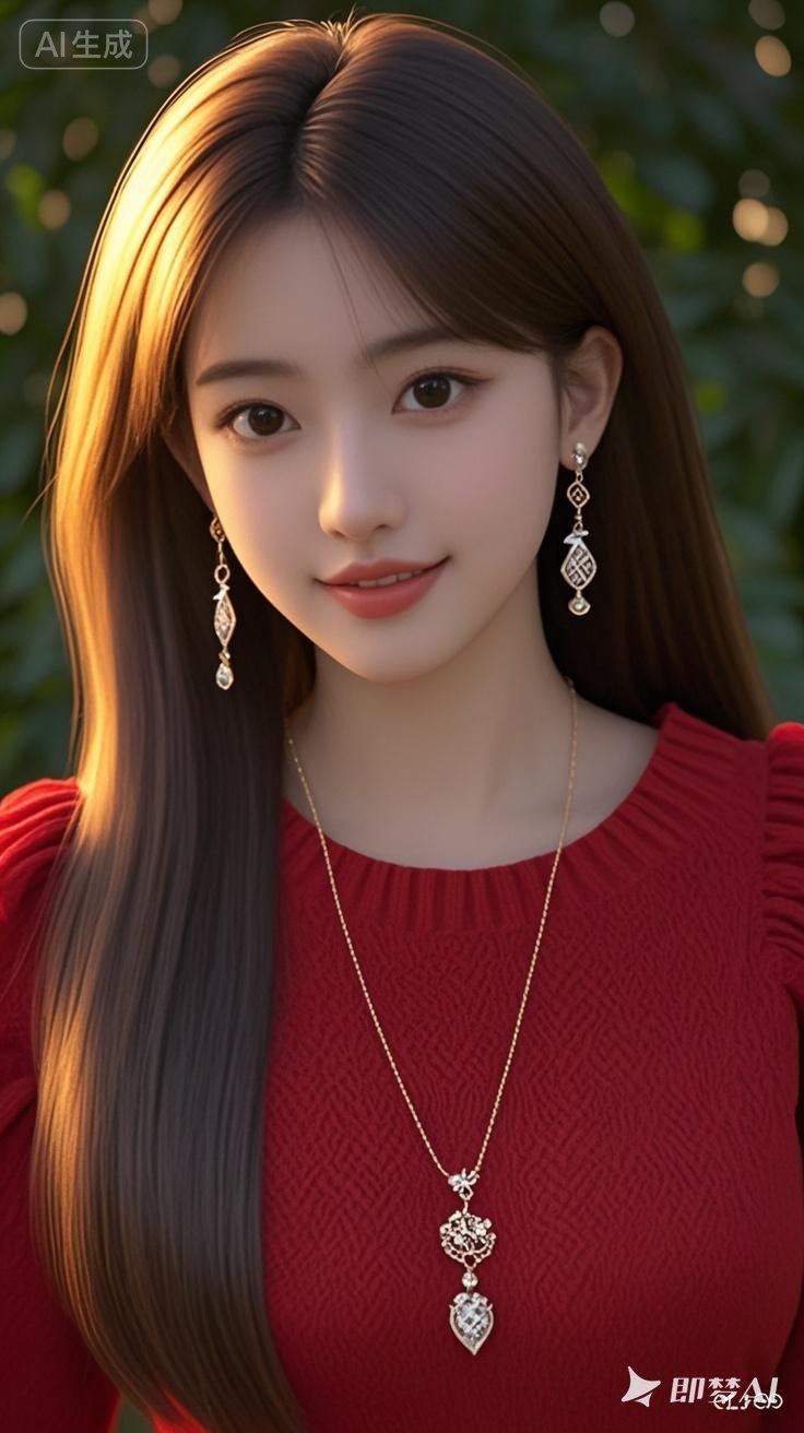 18岁美女,优雅,微笑,发丝柔顺有光泽,长直发,浓眉大眼睛明亮有神,皮肤白皙,长耳坠,长款毛衣长链,红色高档宽松套头暗纹毛大摆连衣长裙,娃娃领木耳边,半袖荷叶边,腰带,背景虚化深绿色叶子,傍晚阳光