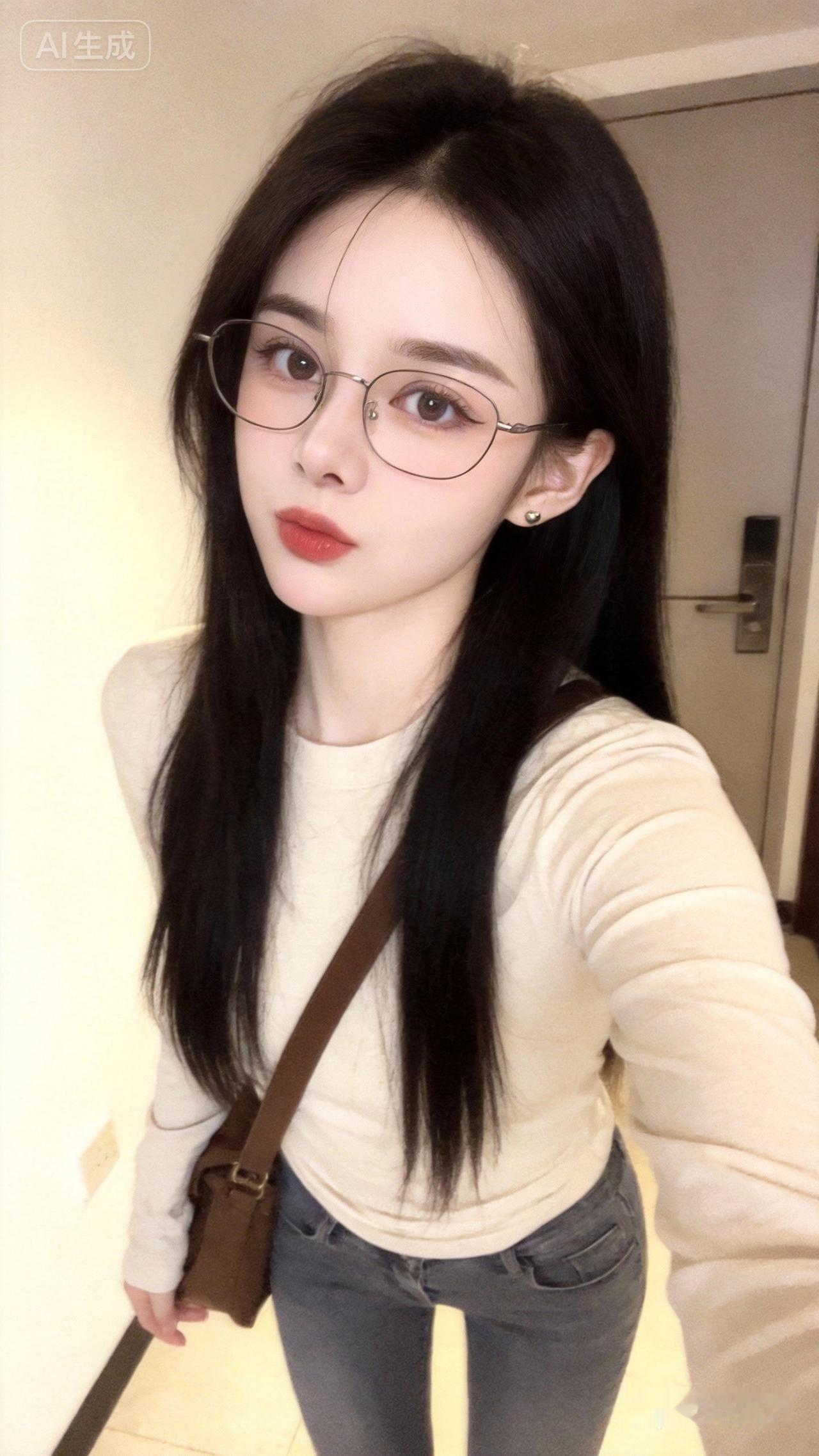 晒图笔记大赛漂亮女生,19岁网红女,黑色长发,皮肤白皙,淡豆沙杏色唇色,米色长袖上衣,灰色紧身牛仔裤,棕色挎包