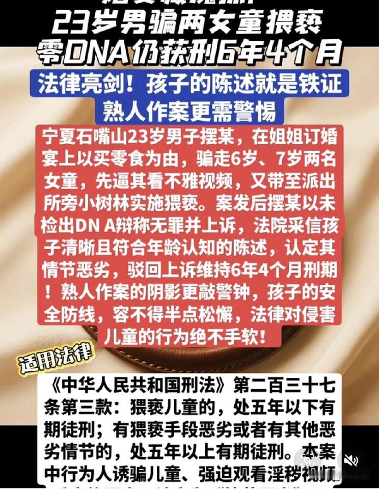 “重判!”23岁男子参加亲戚婚宴,看到两名家长疏于看管的六七岁女孩,动起了坏心思,他以买零食为借口,将两名女孩骗到一处僻静的小树林,强迫她们观看不雅视频,并祸害了其中一名女孩,事后,女孩母亲察觉到异常之后报警,男子很快被抓获,一审被判六年四个月,但他以女孩口腔未检测到某种液体为理由上诉,二审法院认为:女孩的陈述与公安机关调查的其它证据相互印证,事实清楚,依法维持了原判! 这真是造孽啊,真是判的太轻了!
