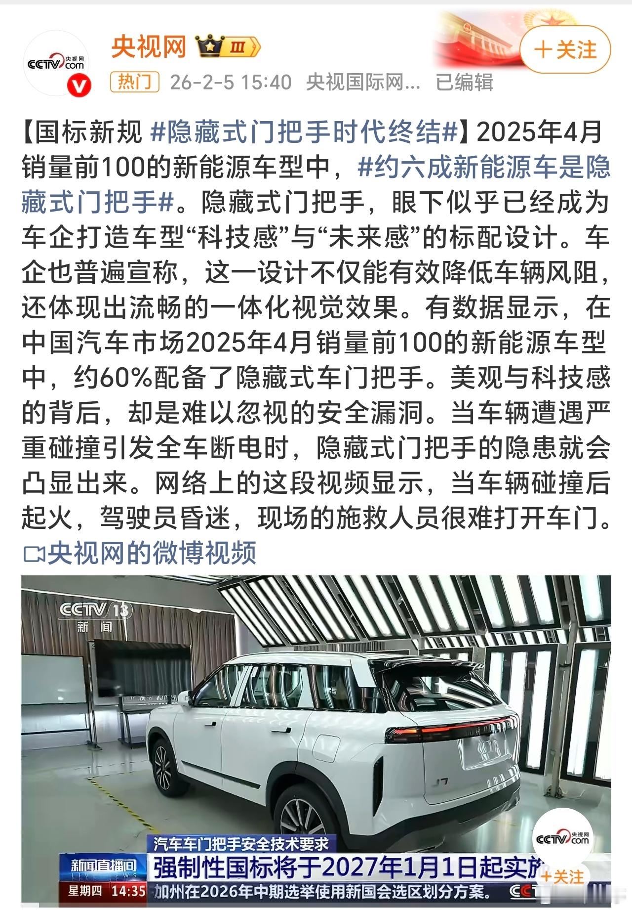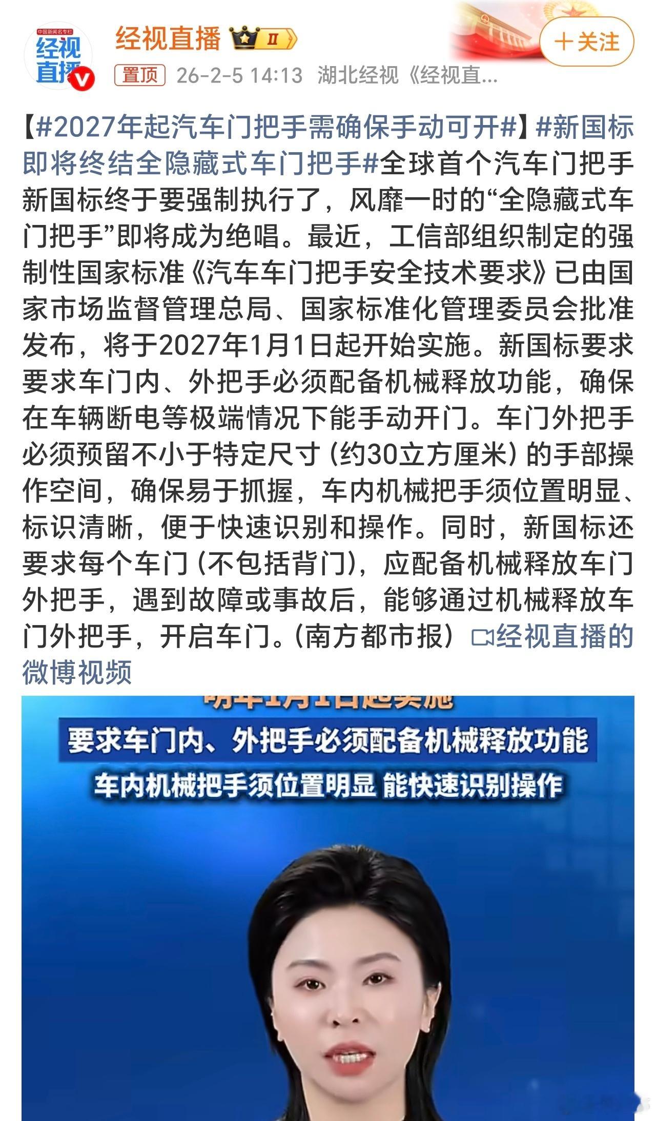 约六成新能源车是隐藏式门把手全球首个汽车门把手新国标终于要强制执行了,新国标要求要求车门内、外把手必须配备机械释放功能,确保在车辆断电等极端情况下能手动开门。看来这也是在某些事件中吸取到了教训,做了一次好的回归~