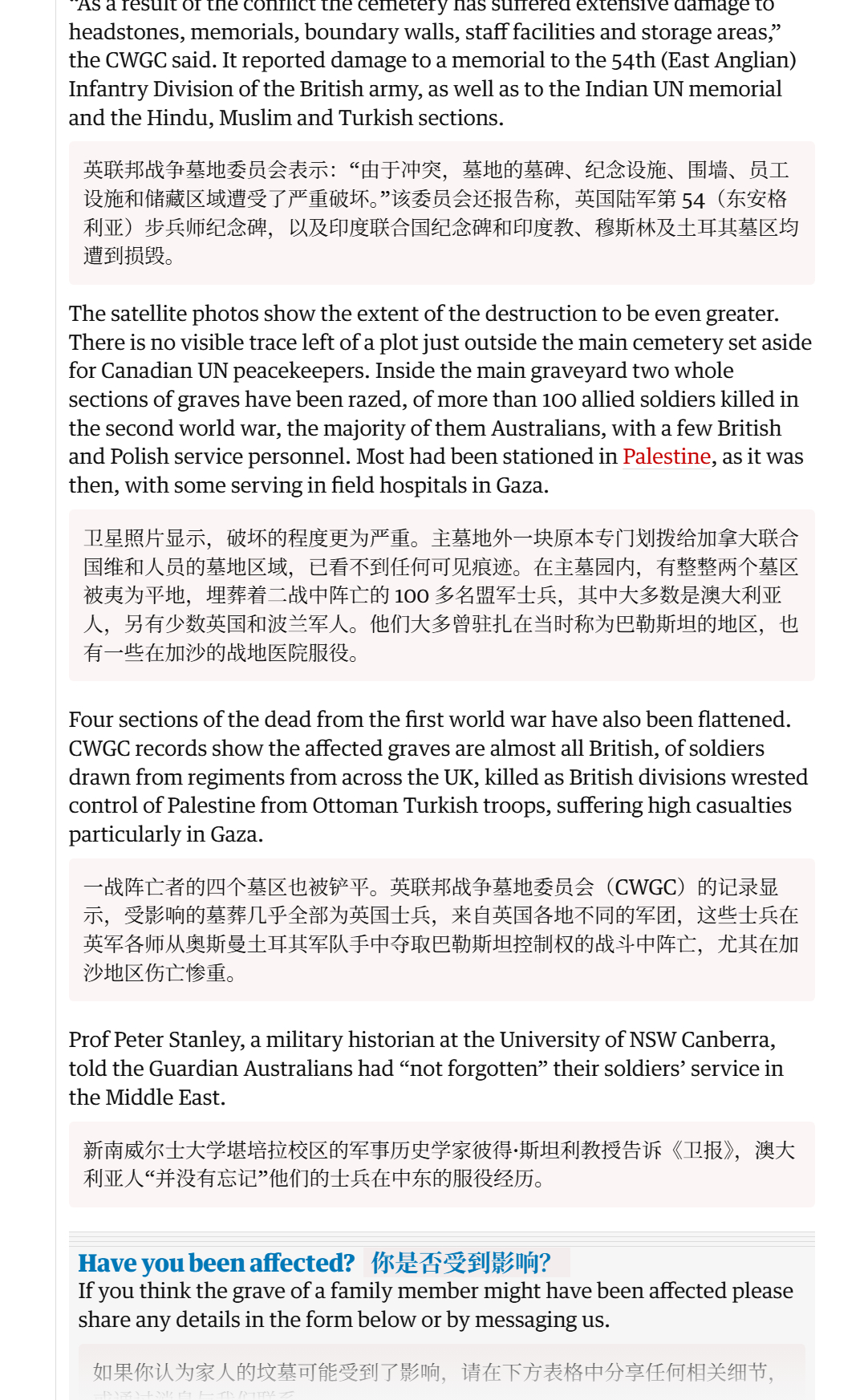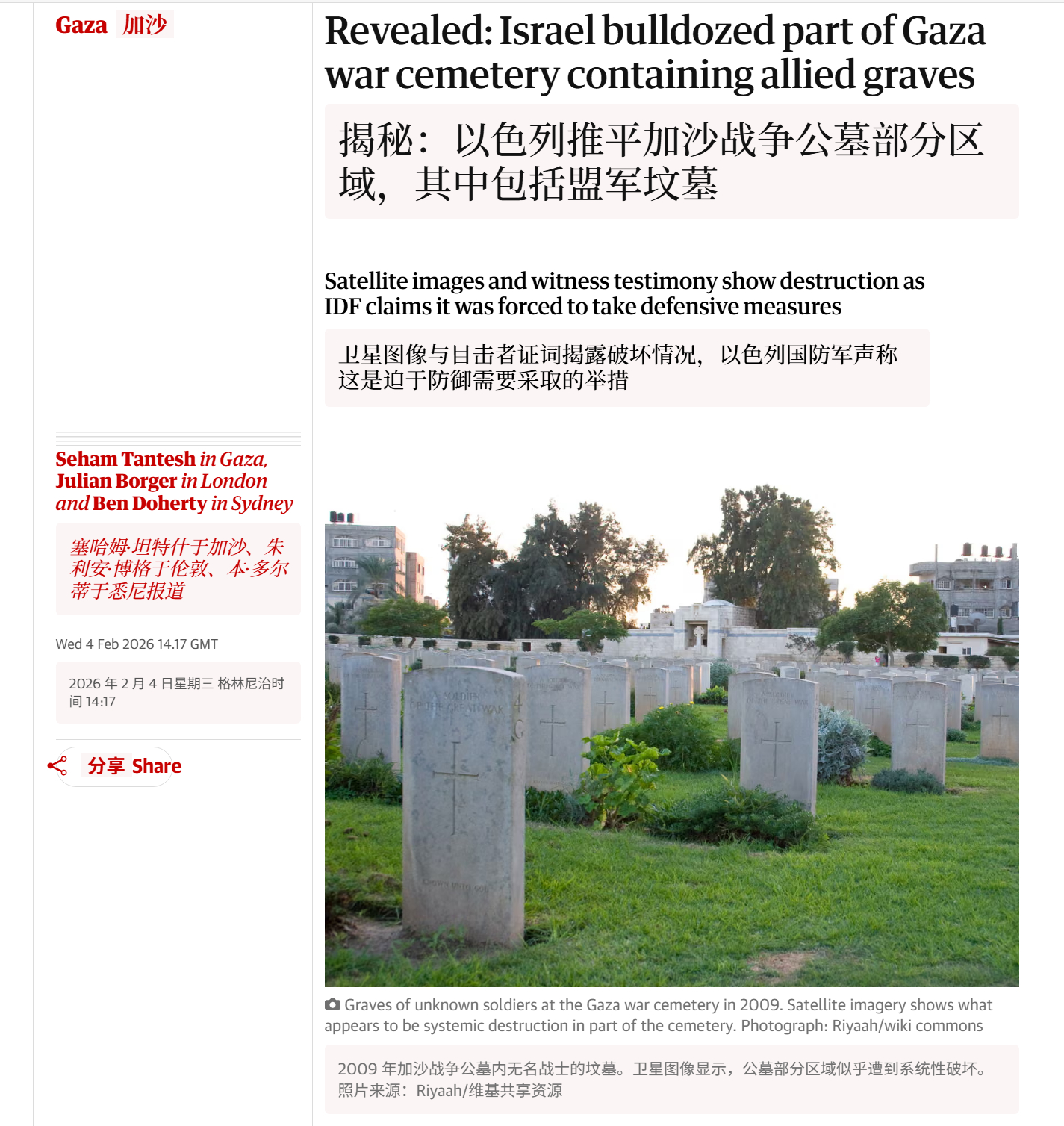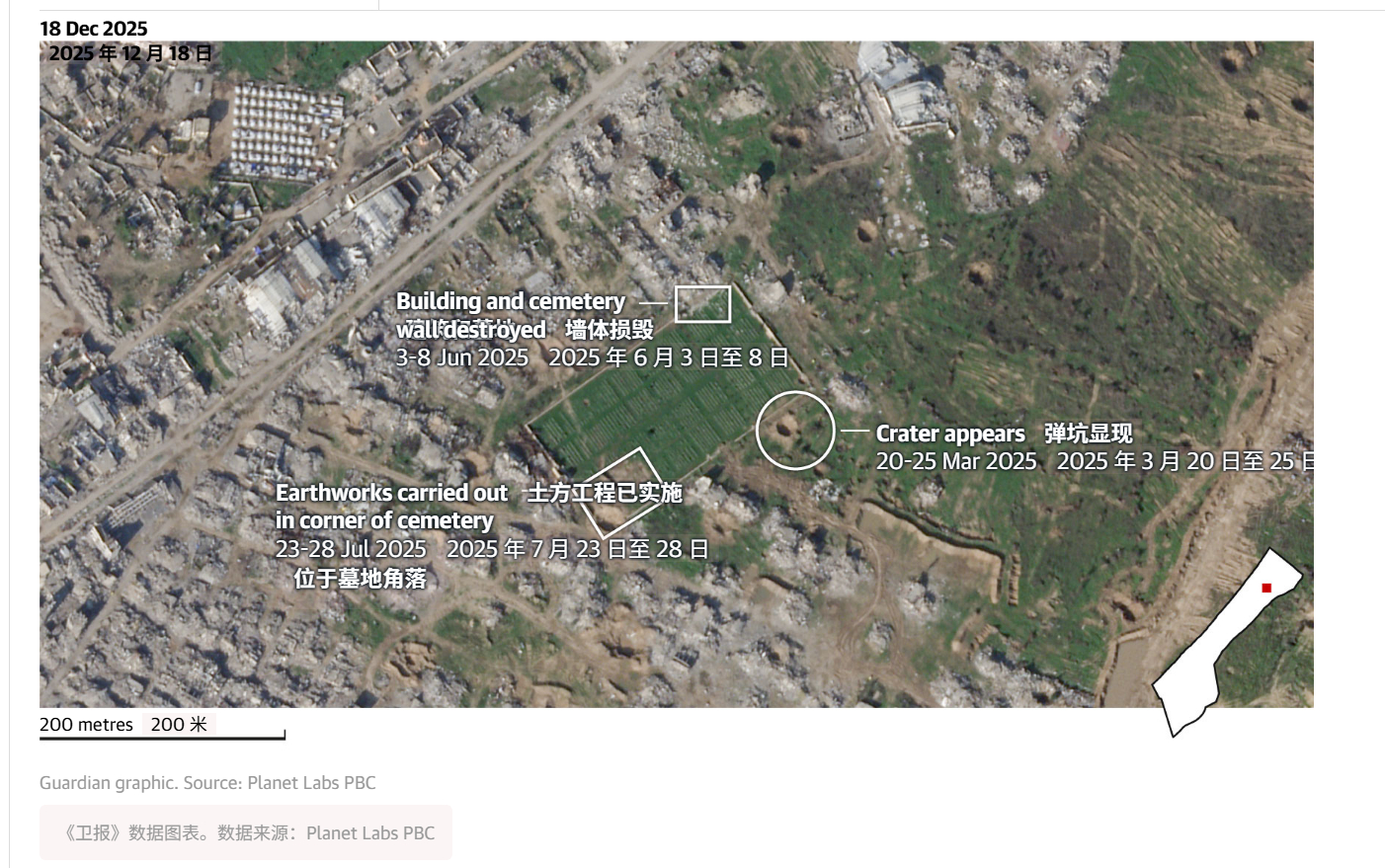 🔻卫星图像和目击者证词显示,去年3月至8月间,以色列军队用推土机推平了加沙城阿尔图法地区加沙战争公墓的部分区域,损毁了第一次和第二次世界大战期间英国、澳大利亚及其他盟军士兵的墓地。🔻图像显示,墓碑被移除,土壤被翻动,用重型机械建造了土堤。🔻以色列国防军称,该地点是活跃的作战区域,这是迫于防御需要采取的举措。🔻来源:《卫报》海外新鲜事热点现场