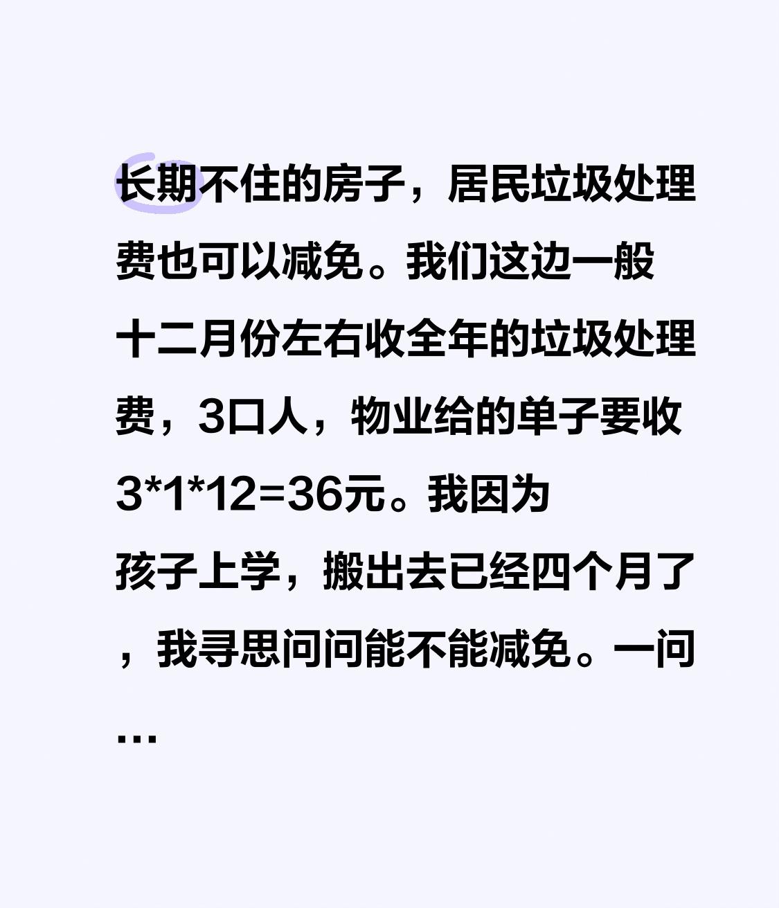 长期不住的房子,居民垃圾处理费也可以减免。 我们这边一般十二月份左右收全年的垃圾处理费,3口人,物业给的单子要收3*1*12=36元。 我因为孩子上学,搬出去已经四个月了,我寻思问问能不能减免。一问,还真是,只需要交8个月的,也就是24元也就可以了。 突然想起来网上说物业费好像也可以减免,等明天问问。 过日子不容易,能省则省。 有相同经历的朋友可以留言告知一下。[握手][握手][握手]