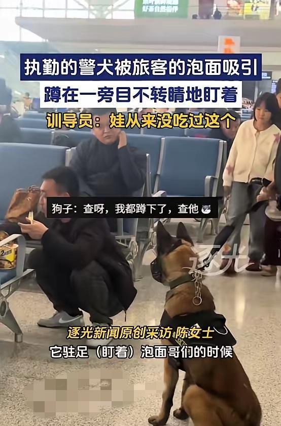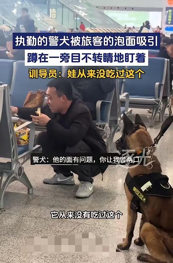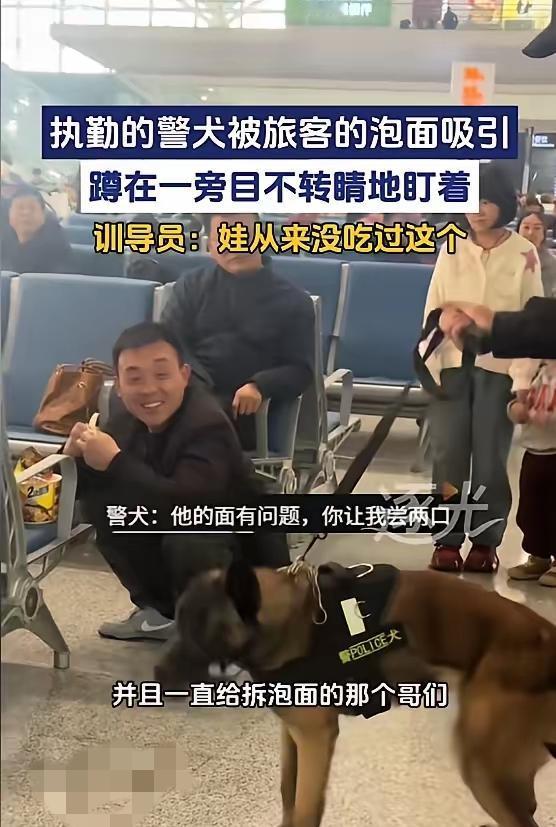 笑不活了家人们!2月1日西安火车站这幕太逗了——一男子候车泡了桶泡面,香味居然把执勤警犬勾得走不动道,蹲在跟前直勾勾盯着,任训导员怎么示意都不挪窝,最后只能尴尬解释“它没吃过这个”。 谁能想到,平时破案安保超勇猛的警犬,也扛不住泡面的诱惑!其实这恰恰说明它们也是有血有肉的小可爱,训练再严格,面对新奇美食的好奇心也藏不住,这份反差感比泡面还上头。 你怎么看?警犬队伍 警犬温情照 高铁养狗